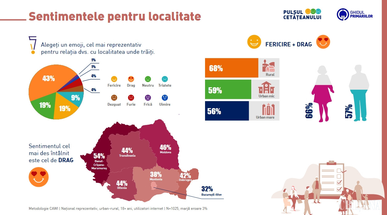 București-Ilfov are cel mai scăzut nivel de sentimente pozitive, doar 32% dintre respondenți exprimând drag și fericire față de localitate, comparativ cu 54% în Banat-Crișana-Maramureș (cel mai mai mare procent), 46% în Moldova și 44% în Transilvania și Oltenia. Femeile tind să aibă o părere mai bună despre localitatea lor, 66% exprimând sentimente pozitive, comparativ cu 57% sentimene pozitive pentru bărbați.