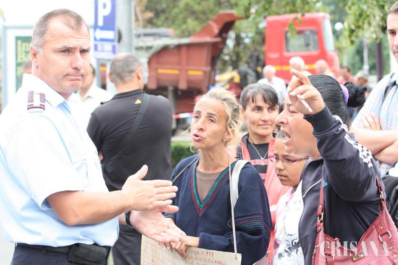 Încă de săptămâna trecută, nouă familii de romi formate din 29 de copii şi 15 adulţi, au decis să picheteze în faţa statuii lui Mihai Eminescu în semn de protest faţă de decizia AIO de a-i evacua de pe strada Eftimie Murgu şi de a-i muta pe strada Uzinelor. Aceştia susţin că imobilul în care au fost mutaţi nu are baie şi grupuri sanitare, motiv pentru care au decis să iasă în stradă. Între cele două părţi s-au purtat discuţii toată săptămâna trecută, ajungându-se la soluţia mutării într-o locuinţă la intersecţia Clujului cu Ogorului. Însă, nici acest lucru nu a fost acceptat de romi. "Pe Ogorului ne-au dat trei camere pentru 20 de persoane. Ne-au băgat în ţigănie", ne-a declarat Mândrucz Elena. Nemulţumiţi de rezultatul negocierilor cu AIO, ieri în jurul orei 10.00, unul dintre protestatari, Lakatos Zoltan, a ales să atragă atenţia altfel. Folosindu-se de schelele montate pe Palatul aflat în renovare, Lakatos s-a urcat pe acoperişul imobilului solicitând să vină la discuţii primarul Ilie Bolojan şi Cristian Beltechi, directorul AIO. Orădenii au asistat apoi la o impresionantă desfăşurarea a forţelor de la Detaşamentul 1 Pompieri Oradea, de la Serviciul Rutier, de la Poliţia Locală şi Ambulanţă. De asemenea, în vecinătatea Palatului Vulturului Negru a fost adusă şi o autospecială de lucru la înălţime aparţinând ISU Crişana, care a primit un apel la 112. Pentru a-l determina pe protestatar să se dea jos, maiorul Lupşea Sorin din cadrul Detaşamentului 1 Pompieri Oradea s-a urcat în pod, de unde a purtat "negocieri", fără succes. Apoi s-a încercat ca un echipaj al pomperilor să ajungă la protestatar cu ajutorul nacelei, însă ameninţările s-au înteţit, iar echipajul s-a retras. Au mai urmat alte 60 de minute de negocieri, ca în jurul ore 12.30 pe acoperiş, utilizând schelele, să ajungă un pomier, care i-a întins o coardă de siguranţă. În final, s-a Lakatos Zoltan a acceptat să se dea jos urcând în nacela autospecialei care a revenit în faţa Palatului Vulturul Negru, cu acceptul protestatarului. Odată adus jos, în siguranţă, acesta a fost urcat în Ambulanţă şi condus la Spitalul Judeţean pentru analize.