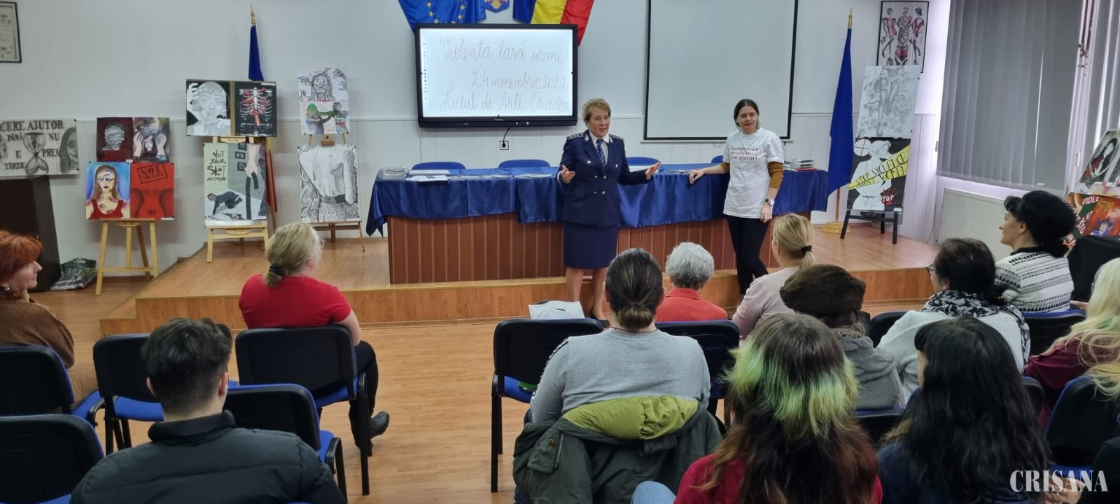 În perioada 24 noiembrie - 10 decembrie a.c., în contextul Zilei internaţionale pentru eliminarea violenţei împotriva femeilor, marcată anual, la 25 noiembrie, polițiștii Compartimentului de Analiză şi Prevenire a Criminalităţii din cadrul Inspectoratului de Poliţie Judeţean Bihor, împreună cu reprezentanții Fundației „Lampas”, cu Direcția Generală de Asistență Socială și Protecția Copilului Bihor, în colaborare cu Comisia judeţeană în domeniul egalităţii de șanse între femei şi bărbaţi organizează o serie de evenimente, menite să trezească și să sensibilizeze conștiința publică cu privire la fenomenul violenței împotriva femeii, un comportament indezirabil, cu efecte negative pe termen lung. În acest context, joi, 24 noiembrie a.c., sub genericul „Uniți împotriva violenței!”, în sala festivă a Liceului de Arte din municipiul Oradea a fost organizată o expoziție de desene cu mesaje sugestive, antiviolență, realizate de elevii acestei instituții, pentru a atrage atenția asupra diferitelor forme de violență cu care se confruntă comunitatea locală și a sublinia că violența este o încălcare a drepturilor omului. Prin creațiile lor, copiii au reușit să transpună, în mod artistic, viziunea proprie cu privire la fața întunecată a violenței domestice, în urma întâlnirilor interactive pe care le-au avut cu polițiștii de prevenire bihoreni. Copiii, deosebit de talentați, au surprins și au creat, cu ajutorul culorilor, imagini cu impact emoțional, conținând mesaje pătrunzătoare, care promovează nonviolența, încurajează luarea de atitudine împotriva violenței în familie, încearcând astfel să conștientizeze opinia publică cu privire la acest fenomen. Elevii Liceului de Arte Oradea au dorit să transmită, prin imagine, consecinţele violenţei şi să sensibilizeze astfel, cetăţenii. 12 dintre desenele realizate cu măiestrie de copii vor fi selectate de membrii Comisiei judeţene în domeniul egalităţii de șanse între femei şi bărbaţi, pentru a ilustra paginile unui calendar pentru anul 2023, cu mesaje antiviolență. De asemenea, joi, chiar de Ziua internaţională pentru eliminarea violenţei împotriva femeilor, polițiștii de prevenire bihoreni și partenerii de program vor organiza o acțiune stradală, cu caracter simbolic, în Piața Unirii din municipiul Oradea, în cadrul căreia vor purta discuții cu cetățenii despre semnificația acestei zile, despre modalităţile concrete de semnalare a cazurilor de violenţă în familie şi despre instituţiile şi organizaţiile care pot oferi sprijin victimelor acestui fenomen, subliniind faptul că, pentru a primi ajutor, victimele trebuie să iasă din anonimat și să reclame violențele suferite. În Piața Unirii vor fi expuse și desenele cu mesaje antiviolență, create de copii. Totodată, în cadrul acțiunii, polițiștii de prevenire bihoreni și reprezentanții Fundației Lampas vor distribui și materiale cu conținut preventiv. În perioada de referință, polițiștii de prevenire bihoreni și partenerii de program vor derula și întâlniri de informare și dezbateri cu reprezentanți ai unor asociații cu atribuții în domeniul asistenței sociale, cu studenții, elevii și persoane vârstnice, în cadrul cărora îi vor informa pe participanți cu privire la legislația în domeniu, instituțiile abilitate să intervină în caz de violență domestică, drepturile victimelor, formele de manifestare a violenței domestice și care sunt pașii de urmat pentru a ieși dintr-o relație abuzivă, pentru a întâmpina nevoile victimelor violenței domestice, a le încuraja să se adreseze autorităților competente și pentru a contribui la stoparea acestui fenomen.