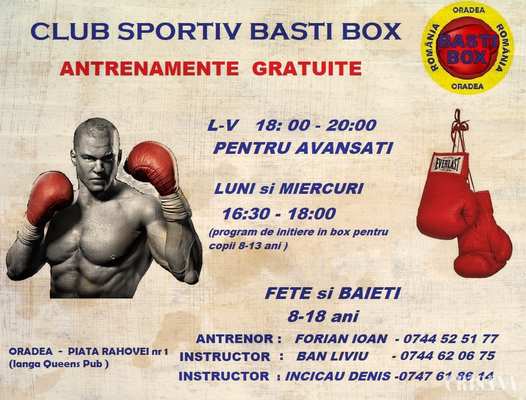 Antrenamentele sunt gratuite, iar doritorii vor găsi antrenori voluntari calificați, care îi vor învăța arta nobilă cu multă grijă la Sala de Box din Oradea situată în Piața Rahovei nr.1, Centrul Educațional Youth Center The Spot, unde avansații se pot antrena zilnic, între orele 18.00 - 20.00 cu antrenorii Forian Ioan - telefon 0744/525-177 și Ban Liviu - 0744/620-675, iar copiii născuți între anii 2009-2012 vor fi iniţiaţi de instructorul sportiv Denis Incicău - 0747618614, între orele 16.30 - 18.00.