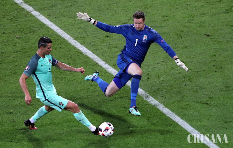 Cristiano Ronaldo, în vârstă de 31 de ani, a marcat primul gol al semifinalei de la Euro 2016 dintre Portugalia şi Ţara Galilor, meci încheiat cu 2-0 şi a ajuns la 9 reuşite în istoria participărilor la Campionatul European, la fel ca francezul Michel Platini, cel mai bun marcator all-time.