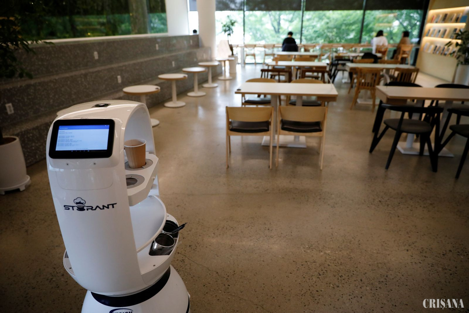 Pentru a ajuta la respectarea acesteia, unele localuri utilizează roboţi, cum este cazul prezentat luni de Reuters, dintr-o cafenea din oraşul Daejeon, Coreea de Sud. Noul barista robot din cafeneaua din Daejeon este amabil şi îşi croieşte rapid drum către clienţi. „Iată ceaiul latte de rooibos şi migdale. Bucuraţi-vă de el! E chiar mai bun dacă îl amestecaţi'', spune acesta în timp ce o clientă întinde mâna spre tava instalată pe computerul alb şi strălucitor, în formă de capsulă.