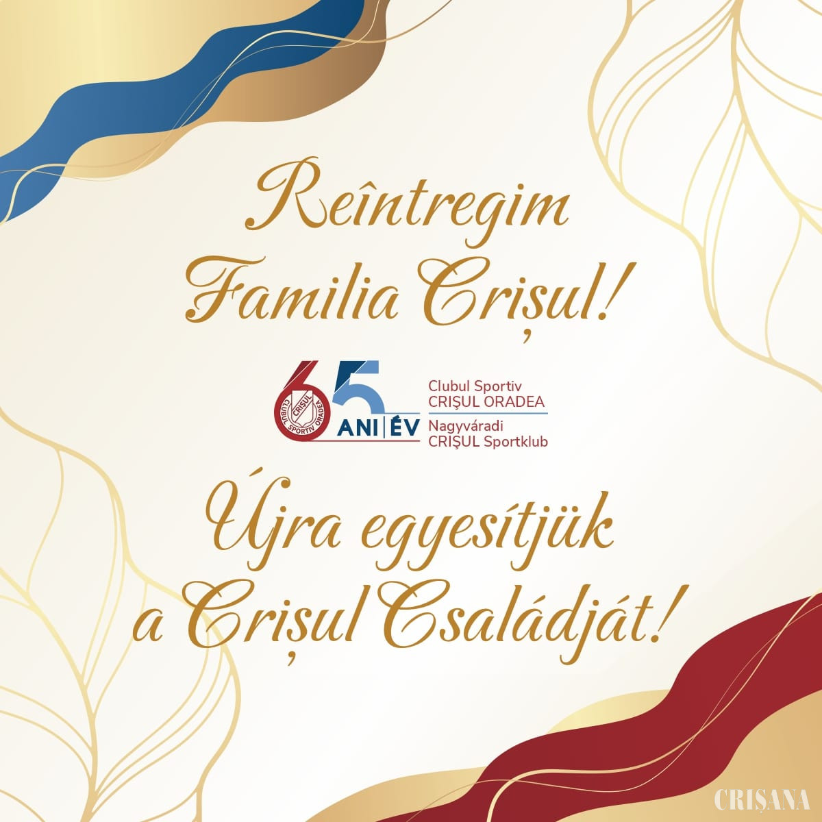 Cu ocazia aniversării a 65 de ani de la înființare, Clubul Sportiv Crișul Oradea invită foștii membri (antrenori, sportivi, etc) pentru a reîntregi familia clubului. Pentru completarea evidenței vă rugăm să ne contactați la numărul de telefon 0740/186.308 sau la adresa de e-mail cscrisul1958@yahoo.com, până la data de 15 mai 2023. Vă așteptăm cu drag!