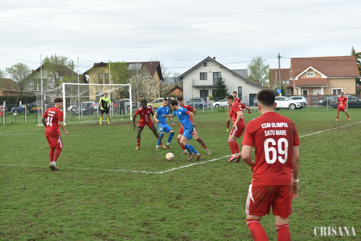 Crişul Sântandrei s-a zbătut mult în duelul cu o pretendentă la promovare, dar primul rezultat pozitiv în play-off-ul Ligii a III-a, Seria 10 se mai lasă aşteptat. CSM Olimpia Satu Mare s-a impus dintr-o lovitură de la 11 metri, consolidându-şi poziţia secundă din top 4.
