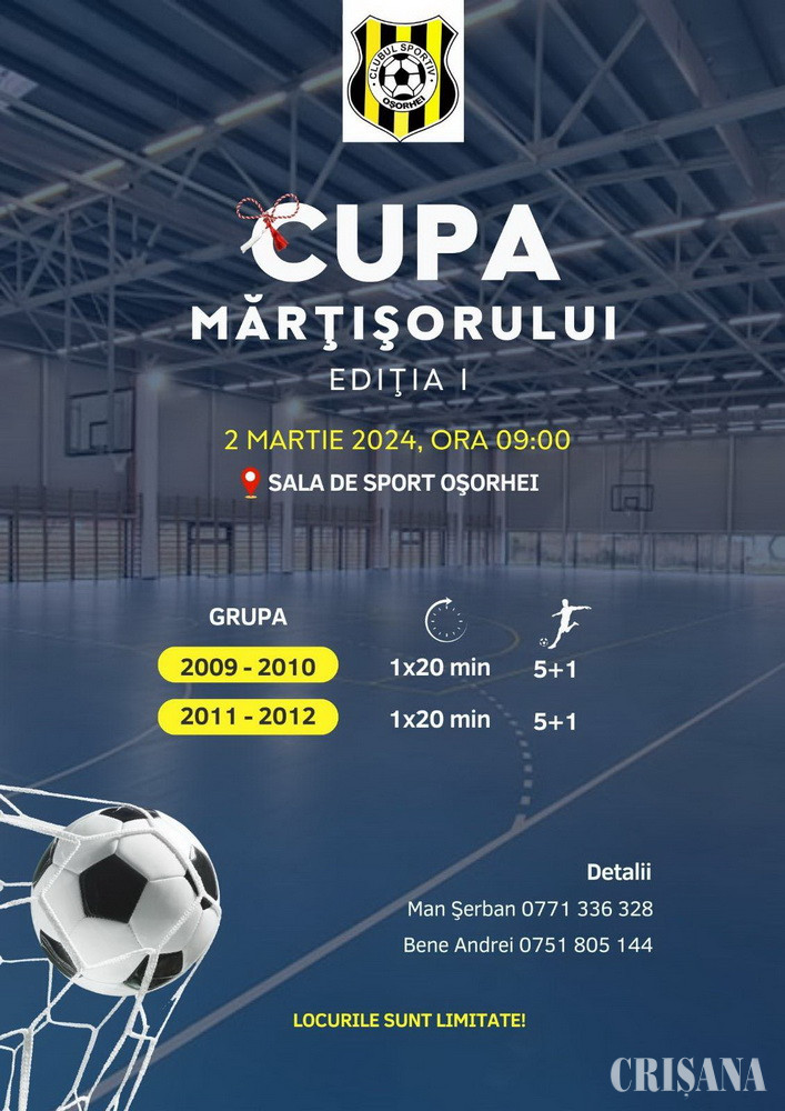 Un interesant turneu juvenil de fotbal se va desfăşura sâmbătă în noua sală de Sport din Oşorhei. Competiţia amicală dotată cu Cupa Mărţişorul este structurată pe două categorii de vârstă, 2009-2010 şi 2011-2012, la ambele meciurile disputându-se în sistem 5+1 pe durata a câte 20 de minute.