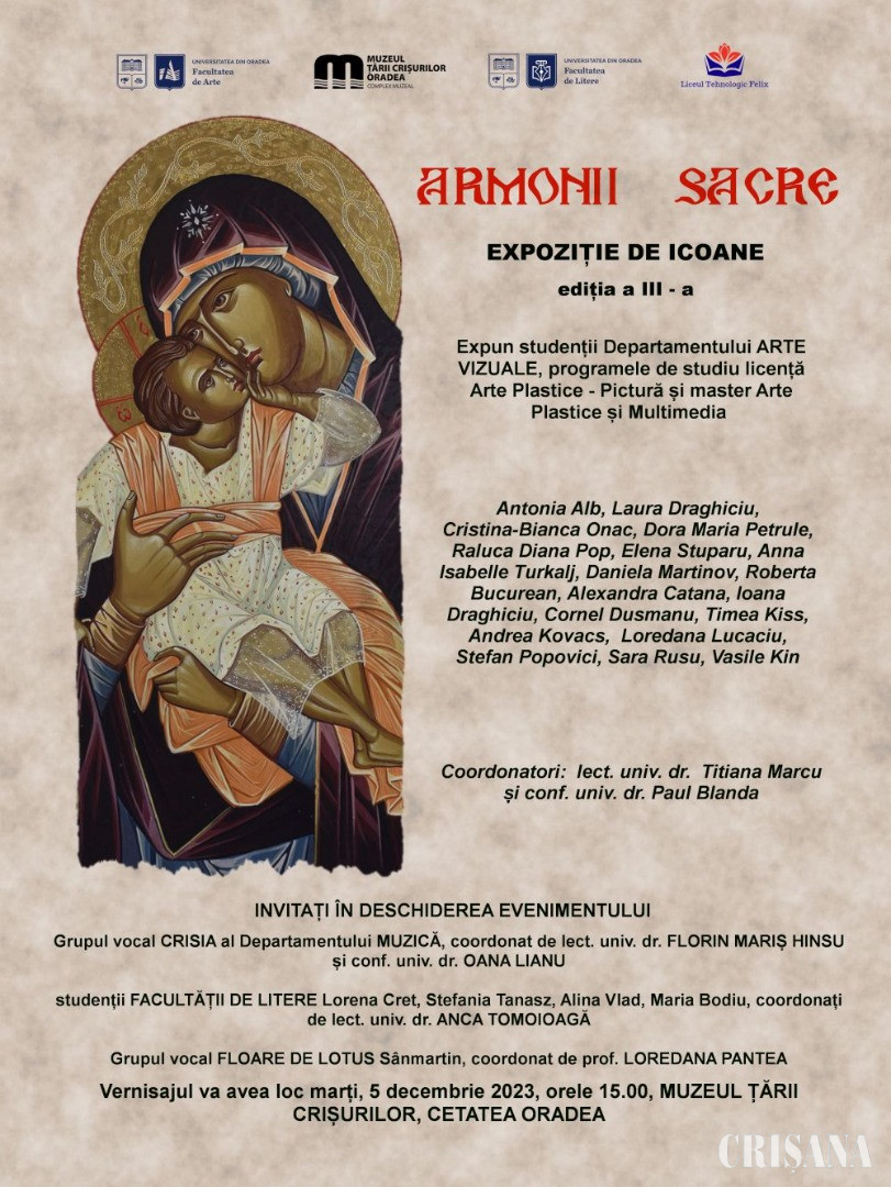 În așteptarea Sărbătorii Crăciunului, Facultatea de Arte a Universității din Oradea îi invită pe toți cei care iubesc credința și artele frumoase la expoziția de icoane „Armonii Sacre”, ediția a III-a.