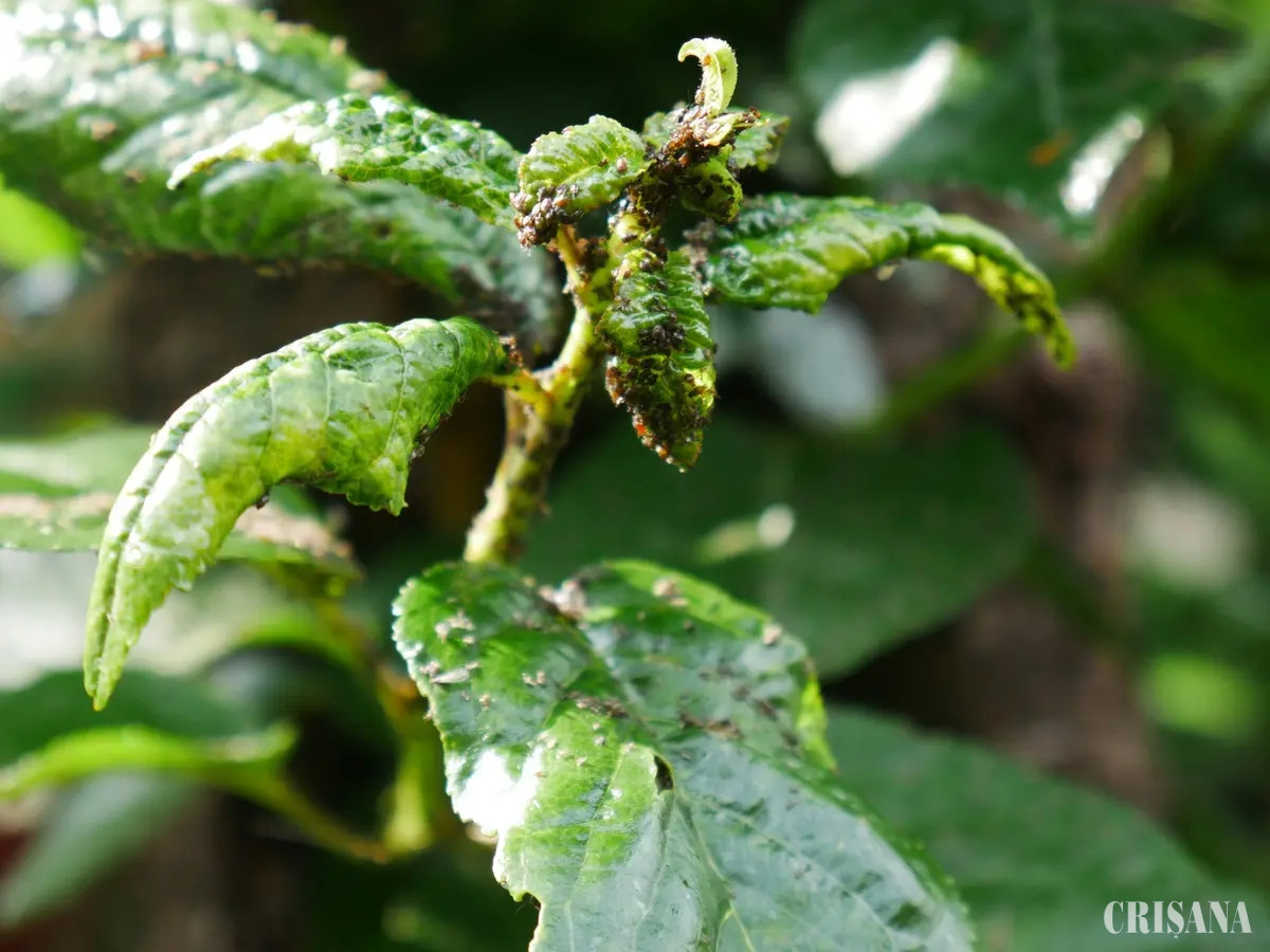 Afidele sunt specii polifage (folosesc ca hrană o gamă variată de plante) şi atacă atât frunzele, cât şi lăstarii tineri. În urma atacului, frunzele devin lipicioase şi se răsucesc. Se mai combat: omizi defoliatoare, ciuruirea, pătarea roşie.