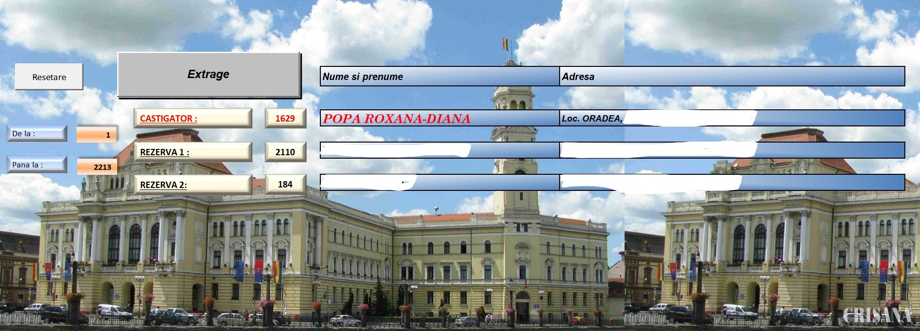 La această tragere la sorți au fost înscriși 2.213 contribuabili care și-au plătit online impozitele datorate pentru anul în curs în perioada 25 februarie – 3 martie. Prin extragere computerizată, a fost desemnat câștigător Popa Roxana Diana, cu domiciliul pe strada J. Gutenberg. Ea va fi înștiințată prin adresă la domiciliu cu privire la posibilitatea ridicării premiului de la sediul Primăriei, în termen de 30 de zile. Voucherul oferă o zi de acces la Aquaparkul Nymphaea pentru 2 adulți și 2 copii sub 18 ani şi este valabil până la sfârşitul anului.
