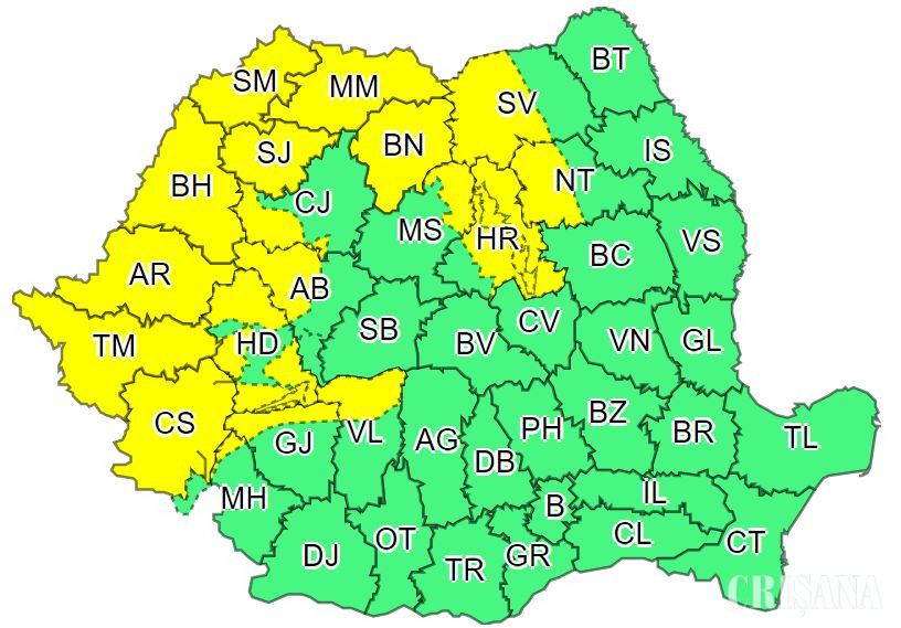 Avertizarea vizează judeţele Satu Mare, Maramureș, Sălaj, Suceava, Bistrița-Năsăud, Neamț, Harghita, Mureș, Covasna, Vâlcea, Mehedinți, Gorj, Alba, Cluj, Bihor, Arad, Timiș, Caraș Severin și Hunedoara.