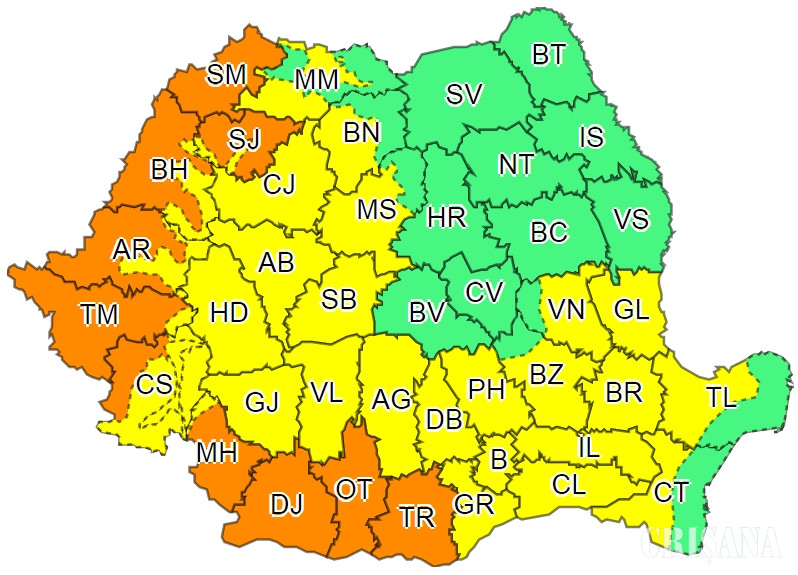 O avertizare Cod portocaliul va fi în vigoare vineri și sâmbătă în județele Satu Mare, Sălaj, Bihor, Arad, Timiș, Caraș-Severin, Mehedinți, Dolj, Olt și Teleorman.