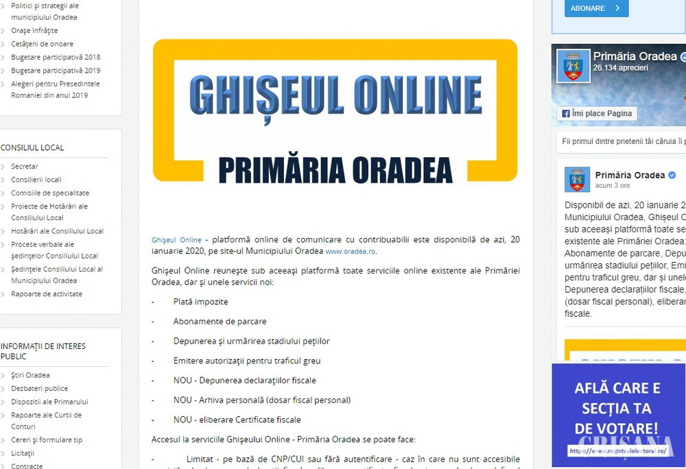 Municipalitatea orădeană a anunţat că platforma online de comunicare cu contribuabilii - Ghișeul Online - este disponibilă de ieri, 20 ianuarie, pe site-ul instituţiei - www.oradea.ro.