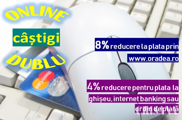 În cazul achitării online prin intermediul site-urilor www.oradea.ro, www.ghiseul.ro și aplicația „Plata Impozite MobilePay” se acordă următoarele bonificaţii: 8% în cazul impozitului pe clădiri persoane fizice și juridice; 8% în cazul impozitului pe teren persoane fizice și juridice; 8% în cazul impozitului pe mijloacele de transport persoane fizice și juridice. Tot pentru încurajarea achităii online a taxelor şi impozitelor locale, Primăria Oradea derulează, şi în acest an, campania „Plăteşte impozitul online şi câştigă o zi de distracţie la Aquapark Nymphaea”, în cadrul căreia vor fi premiate persoanele și firmele care vor plăti online taxele și impozitele datorate pe anul 2020 până la data de 31 martie, acordând, săptămânal, prin tragere la sorți, un voucher, constând într-un bilet de familie pentru o zi la Aquapark Nymphaea.