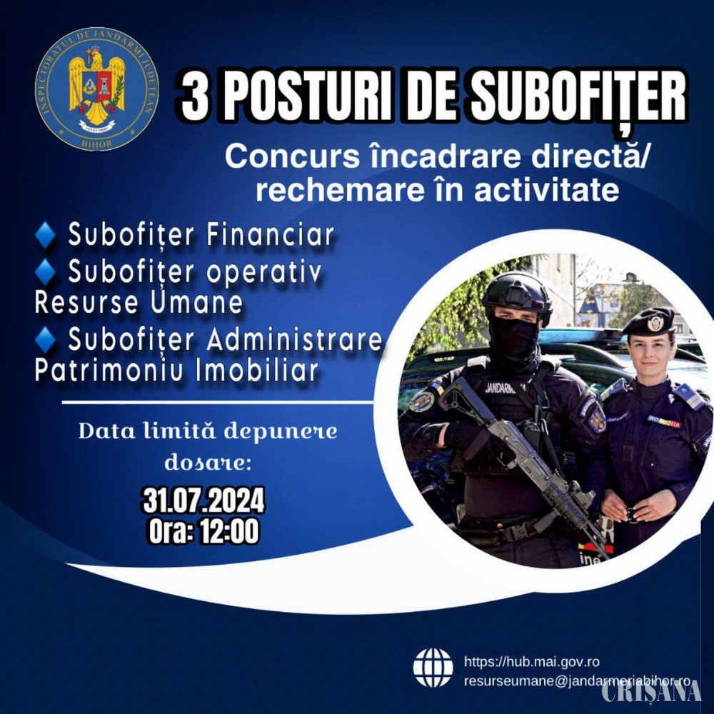 Termenul limită pentru depunerea cererilor și a dosarelor de înscriere în format complet este pâna la data de 31 iulie 2024, ora 12.00. Dosarul se transmite scanat lizibil, integral, în format PDF, la adresa de e-mail: resurseumane@jandarmeriabihor.ro. Anunțurile în integralitate și detalii privind condițiile ce trebuie îndeplinite, formularele și modelele documentelor constitutive ale dosarului de înscriere, informații referitoare la probele de concurs, tematica și bibliografia pentru fiecare concurs în parte se regăsesc accesând link-urile: https://hub.mai.gov.ro/recrutare/anunt/view?id=3989 - Concurs subofițer Financiar; https://hub.mai.gov.ro/recrutare/anunt/view?id=3935 - Concurs subofițer operativ Resurse Umane; https://hub.mai.gov.ro/recrutare/anunt/view?id=4034 - Concurs subofițer Administrare Patrimoniu Imobiliar. Informații suplimentare referitoare la desfășurarea concursului se pot obține de la Serviciul Resurse Umane din cadrul Inspectoratului de Jandarmi Județean Bihor, apelând numărul de telefon 0259/430770, de luni până vineri, între orele 10.00 – 14.00.