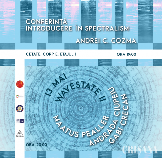 Evenimentul va avea loc la ora 19.00, în Cetatea Oradea, la etajul I, din corpul E. Conferința dedicată muzicii spectrale va fi susținută de muzicologul Andrei C. Cozma și va fi urmată de un concert, în cadrul căruia vor intra în dialog Maatus Pealler, la caval, Andrada Ciupeiu, la vioară și Gabi Crecan, la synth.