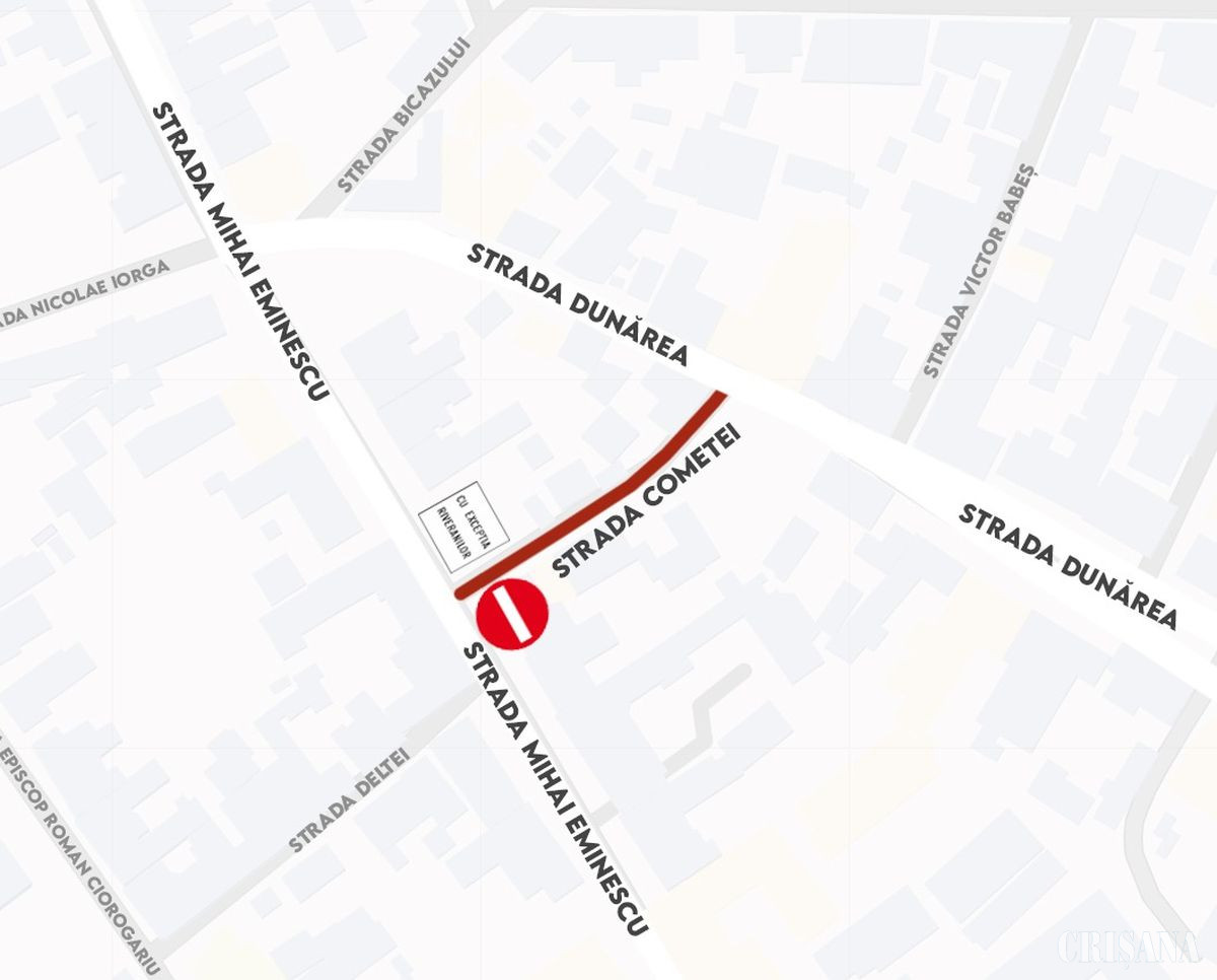 A treia măsură presupune închiderea străzii Cometei în perioada 5 mai – 5 iunie, cu excepția riveranilor, pentru executarea unor lucrări la rețelele edilitare de apă și canalizare, derulate de Compania de Apă Oradea.