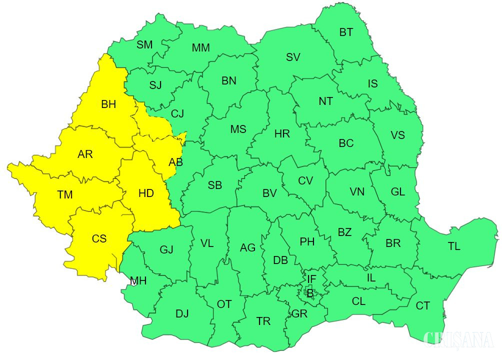 Vineri între orele 12.00 - 21.00, în Banat, Crișana și în vestul Transilvaniei instabilitatea atmosferică va fi accentuată și se va manifesta prin averse, descărcări electrice, intensificări de scurtă durată ale vântului și izolat grindină.