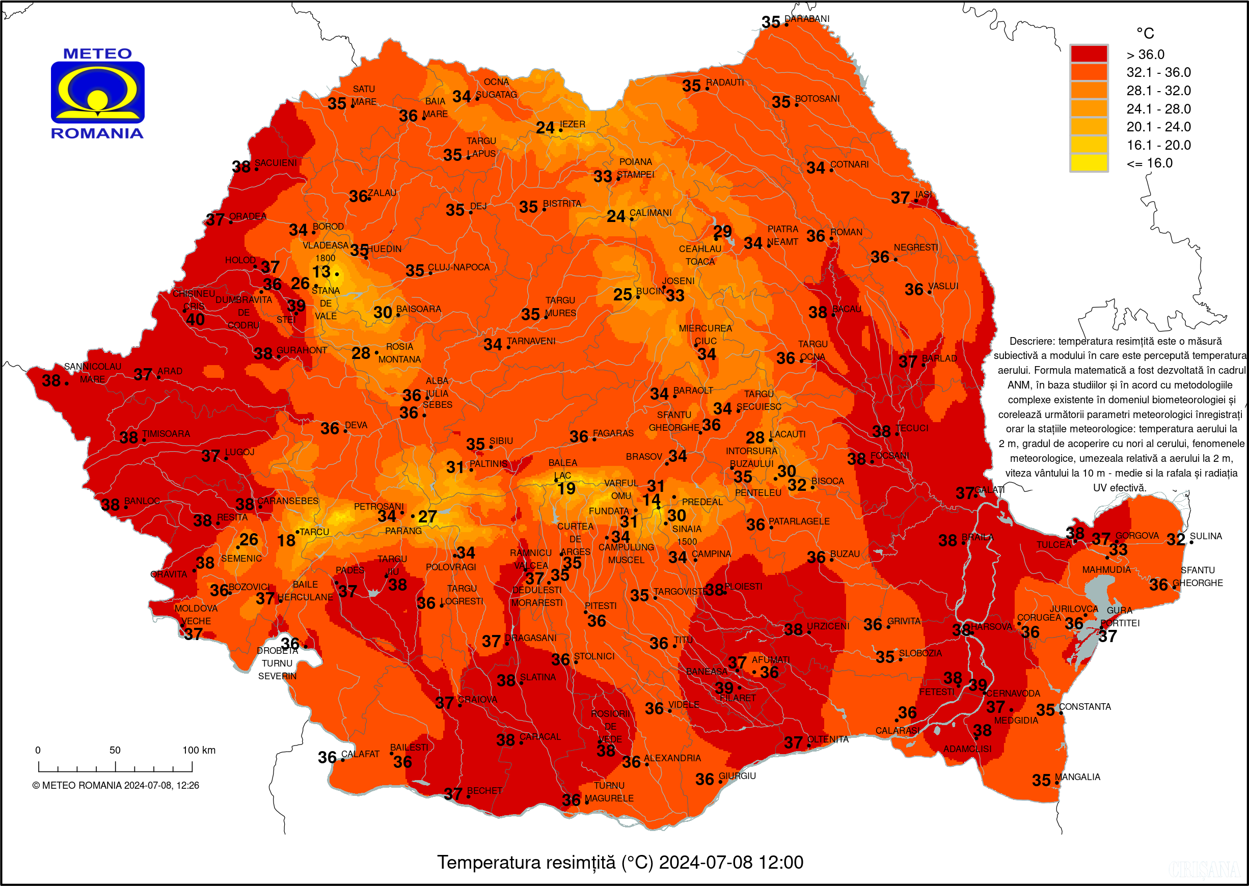 Pe parcursul primei săptămâni, valul de căldură va fi persistent, va fi caniculă, cu medii ale temperaturilor maxime de 35...38 de grade, valori izolat mai ridicate fiind posibile între 11 și 13 iulie. Nopțile vor deveni tropicale, minimele termice urmând a se situa între 20 și 24 de grade, în medie regională. După data de 15 iulie, este estimată o ponderare a regimului termic, totuși vor fi după-amiezi cu vreme local caniculară; temperaturile maxime vor fi de 32...35 de grade, iar minimele de 17...21 de grade, în medie regională.