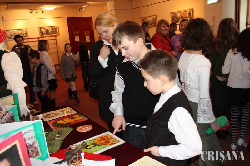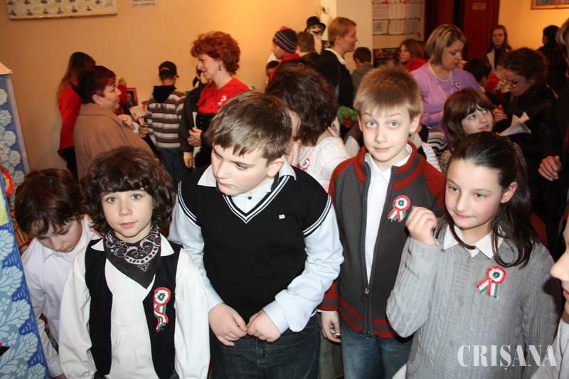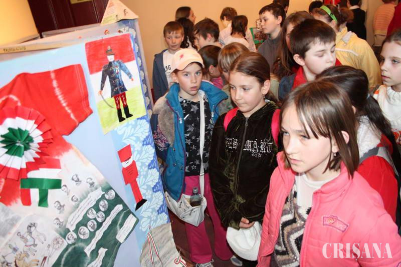 La intrarea în hol, toţi cei prezenţi au primit cocarde în culorile roşu-alb-verde, pe care le-au pus în piept, în semn de omagiu pentru ziua de 15 martie. Şcoala cu clasele I-VIII "Dimitrie Cantemir" s-a implicat în acest proiect prin învăţătoarele secţiei maghiare: Balajti Anamaria, Melinda Stanca, Eniko Fandly şi Silvia Barta. "Lucrările au fost realizate în cadrul concursului File din istorie, devenit deja tradiţional. Din octombrie până în februarie, din toată ţara, peste 500 de copii şi-au trimis lucrările, care au fost apoi premiate de către profesori de istorie şi arte plastice", ne-a declarat profesoara Eniko Fandly, de la Şcoala "Dimitrie Cantemir", menţionând că în fiecare an concursul "File de istorie" a avut o anumită temă, cea de anul acesta fiind "Revoluţia din 1848", în jurul căreia elevii au putut realiza diferite lucrări, folosindu-şi imaginaţia. În cadrul expoziţiei, şi-au prezentat lucrările şi elevii din clasa a IV-a de la Şcoala cu clasele I-VIII din Borş.