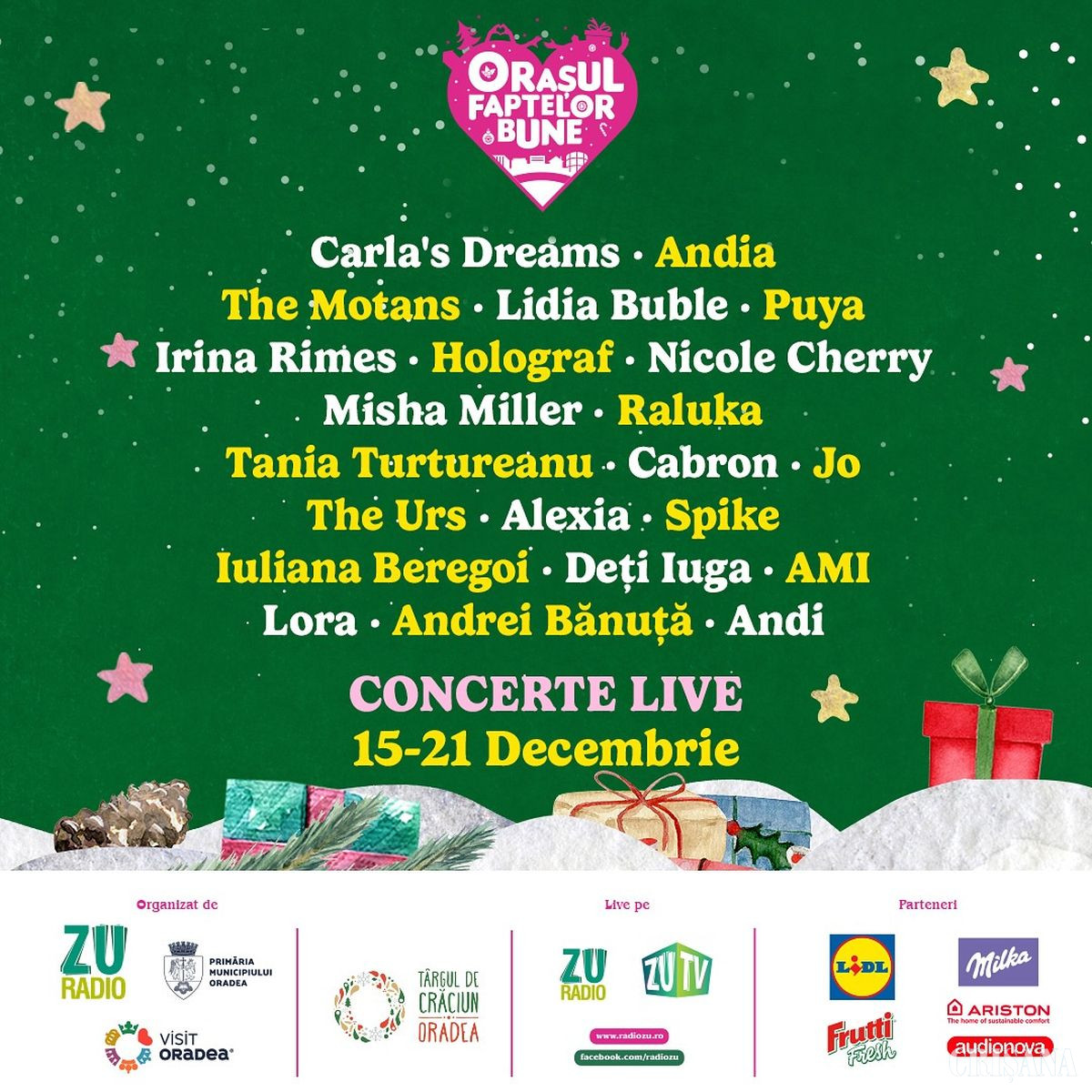 Duminică, 15 decembrie, la ora 14.00, Mihai Morar, Daniel Buzdugan, Adi Mihăilă „The Hitman”, Răzvan Popescu, Cuza, Raluca Benavides, Emma și Tea Teodorescu vor deschide din nou porțile Orașului Faptelor Bune în Piața Unirii din Oradea, un prilej perfect pentru cei prezenți pentru o sesiune de poze cu Dji preferați. În prima seară vor urca pe scenă: Iuliana Beregoi, The Motans și Holograf.
