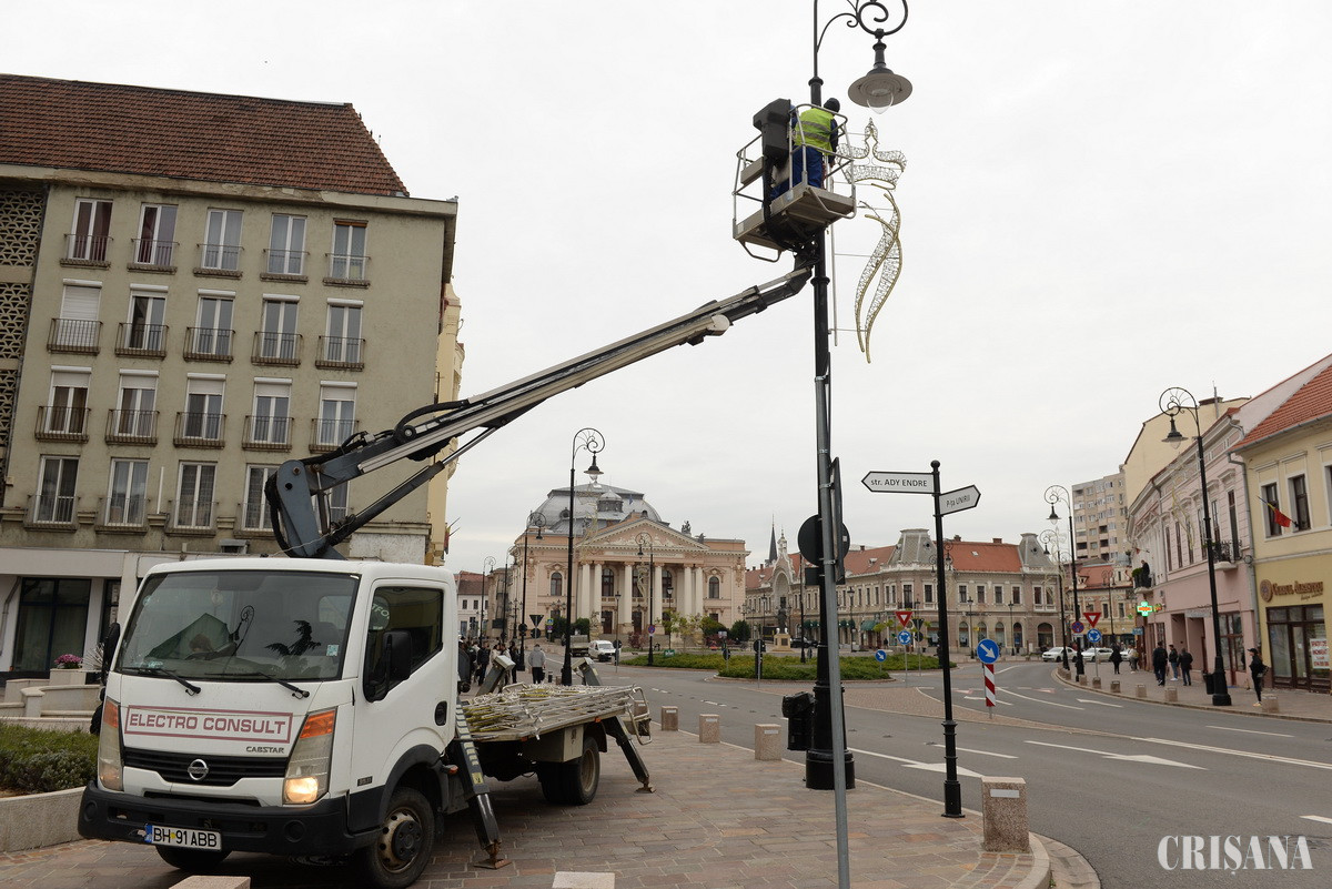 Municipalitatea orădeană a început montarea iluminatului festiv, care va fi realizat, anul acesta, în Piața Unirii, str. Vasile Alecsandri, Podul Sfântul Ladislau, Piața Ferdinand, str. Republicii (zona pietonală), str. Libertății şi str. Grigorescu, str. Aurel Lazăr și Primăria Oradea.