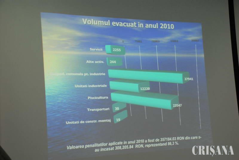 Potrivit statisticilor Administraţiei Bazinale de Apă Crişuri în cursul anului trecut s-au realizat 32 de investiţii în bazinul hidrografic Crişuri, în valoare de 92.236.000 lei. Dintre acestea, 19 au fost realizate în judeţul Bihor, valoarea lor fiind de 73.148.000 lei. În 2010, în urma monitorizărilor apelor pe clase de calitate după indicatorii fizico-chimici efectuate de Administraţia Bazinală de Apă Crişuri, a rezultat că 26% din râuri sunt de clasa I, 68% sunt râuri de clasa a II-a, 3,26% râuri de clasa a III-a, în timp ce 2,37% sunt râuri de clasa a IV-a. Cel mai mare volum de apă evacuat în 2010 a fost din unităţile de gospodărire comunală, urmat de unităţi industriale, piscicultură, gospodărire comunală pentru industrie, comerţ şi servicii. Pe baza rezultatelor analizelor fizico-chimice, în 2010 au fost aplicate 31 de penalităţi pentru depăşirea limitelor admise la indicatorii de calitate prevăzuţi în actele de reglementare. Valoarea penalităţilor aplicate anul trecut a fost de 357.184.030 lei, din care s-au încasat 86,3 %, adică 308.205.840 lei. În 2010 au fost trasate benzile de inundabilitate pentru râurile Crişul Alb, Crişul Negru, Crişul Repede şi Barcău. În ceea ce priveşte inundaţiile, în anul 2010 în bazinul Crişuri au fost înregistrate depăşiri ale cotelor de pericol, dar fără ca acestea să creeze pagube semnificative. Şi pentru acest an ABA are mai multe planuri. Astfel, graficul prevede începerea lucrărilor la două acumulări nepermanente, este vorba despre Topa şi zona Criştior. De asemenea, în planul din acest an se încadrează şi finalizarea acumulării nepermanente de la Ginta. "Ne propunem să finalizăm lucrarea de la Ginta, care o este acumularea nepermanentă. În câteva săptămâni, în funcţie de condiţiile meteorologice, dorim să începem şi amenajarea malului Crişului din zona Colegiului Naţional "E. Gojdu"", a precizat Pastor Sandor, directorul ABA Crişuri.