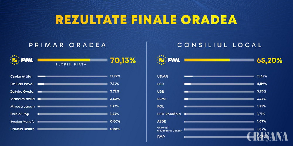 La Oradea, în urma scrutinului de duminică, 27 septembrie, noul primar este liberalul Florin Birta, care, potrivit Biroului Electoral Municipal, a obținut 47.966 voturi, fiind votat de 70,13% dintre orădenii care s-au prezentat duminică la vot. Pe următoarele locuri au fost: Cseke Attila (UDMR) – 7.795 voturi (11,39%), Emilian Pavel (PSD) – 5.297 voturi (7,74%), Zatyko Gyula (PPMT) – 2.546 voturi (3,72%), Ioana Mihăilă (USR-PLUS) – 2.078 voturi (3,03%), Mircea Jacan (POL) – 869 voturi (1,27%), Daniel Pop (Pro România) – 848 voturi (1,23%), Bogdan Manafu (PMP) – 592 voturi (0,86%), Daniela Ghiuro (ALDE) – 400 voturi (0,58%).