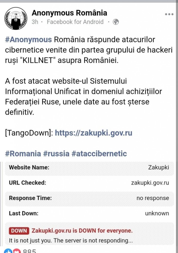 Drept răspuns la atacurile declanșate de hackerii ruși asupra unor site-uri guvernamentale românești, Anonimus România contraatacă și blochează site-ul de achiziții unificat al Federației Ruse. Hackerii ruși au continuat și astăzi atacul, fiind vizat site-ul Directoratului Național de Securitate Cibernetică.