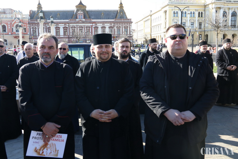 La Oradea, evenimentul a început sâmbătă, la ora 15.00, cu o adunare publică în Piaţa Unirii, la eveniment fiind prezenţi liderii culteor religioase din judeţ, respectiv episcopul ortodox Sofronie Drincec, episcopul romano-catolic László Böcskei, episcopul greco- catolic Virgil Bercea, pastorul Petru Vidu, preşedintele comunităţii baptiste, pastorul Liviu Apolzan, preşedintele comunităţii penticostale şi rectorul Universităţii Emanuel, profesorul Paul Negruţ. În Piaţa Unirii s-au adunat câteva sute de persoane, purtând pancarte şi afişe cu mesaje precum „Un copil avortat este omor calificat", „Familia spune DA vieţii" sau „Cum să meargă ţara bine cu milioane de nepedepsite crime?".