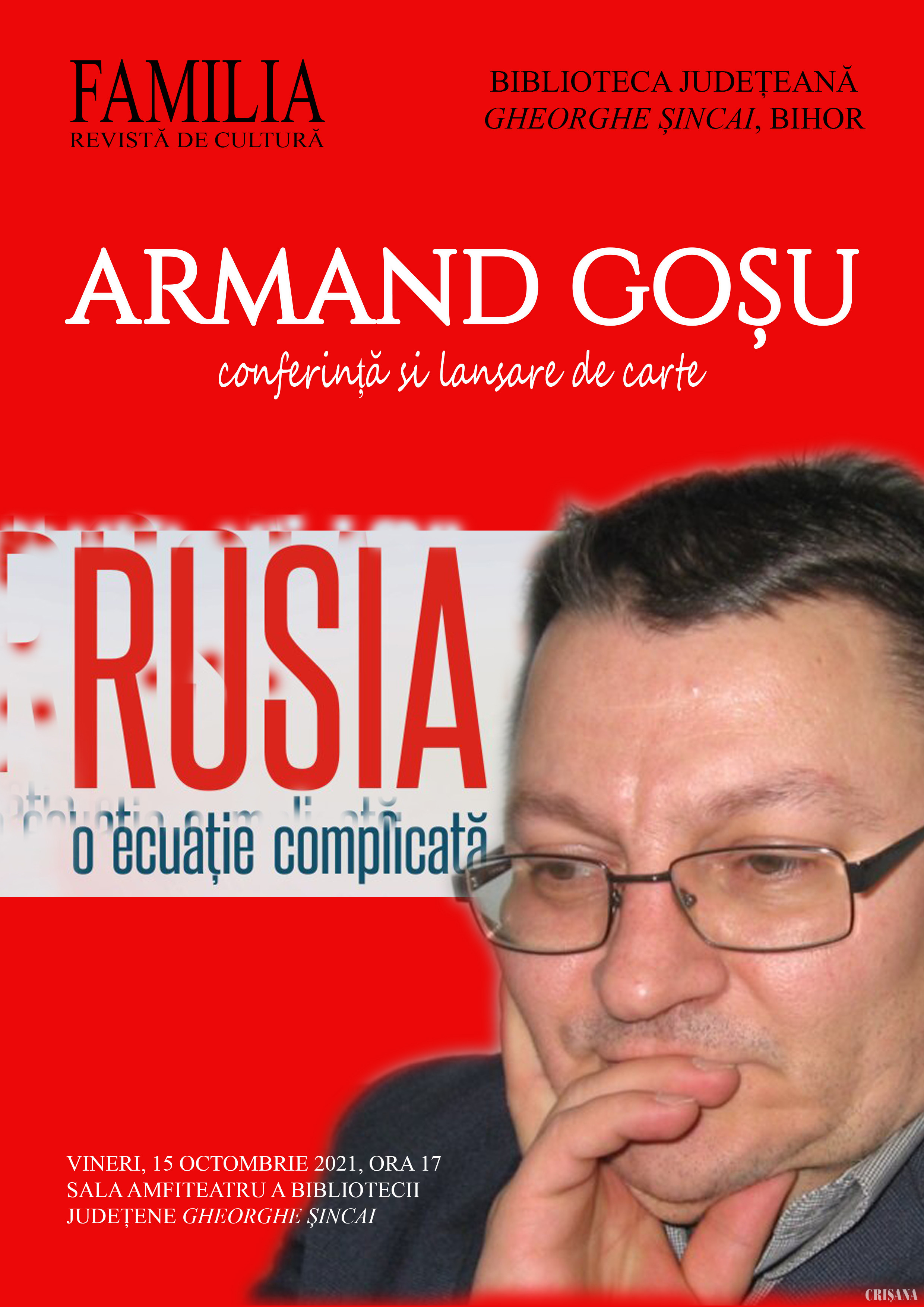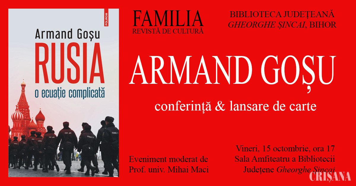 Unul dintre cei mai importanţi istorici şi analişti politici ai Estului European, Armand Goşu, va fi prezent la Oradea vineri, 15 octombrie, în cadrul unui eveniment organizat de Revista Familia şi Biblioteca Judeţeană „Gheorghe Şincai Bihor”.