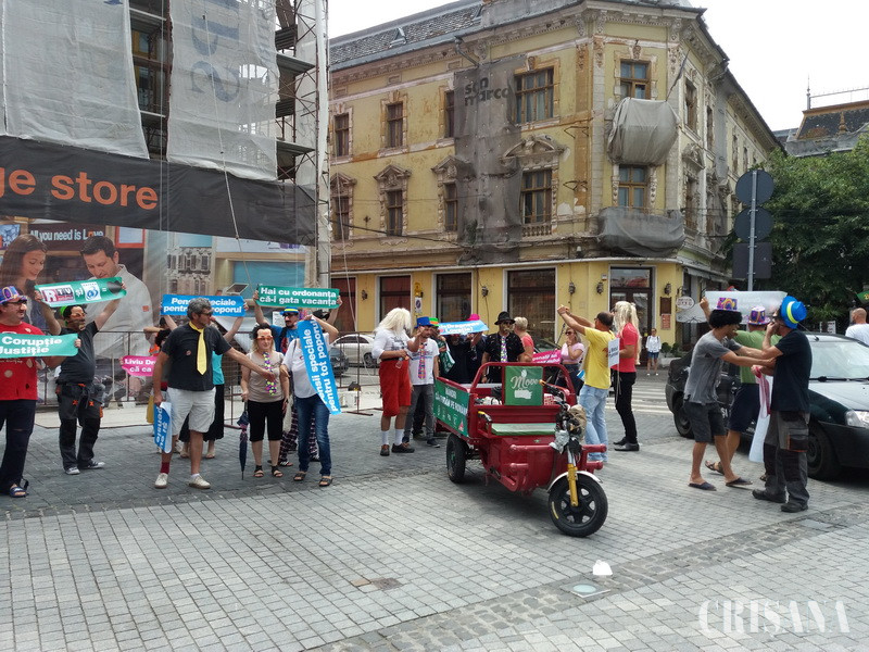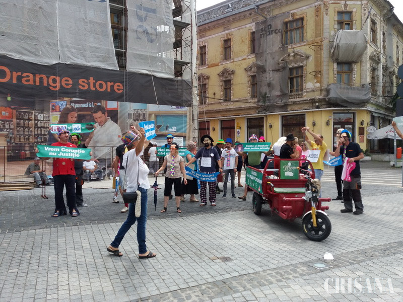 Parodia a continuat de-a lungul Corso-ului orădean, până la Magazinul Crişul, unde actorii-protestatari şi-au epuizat şi „pomenile electorale”.
