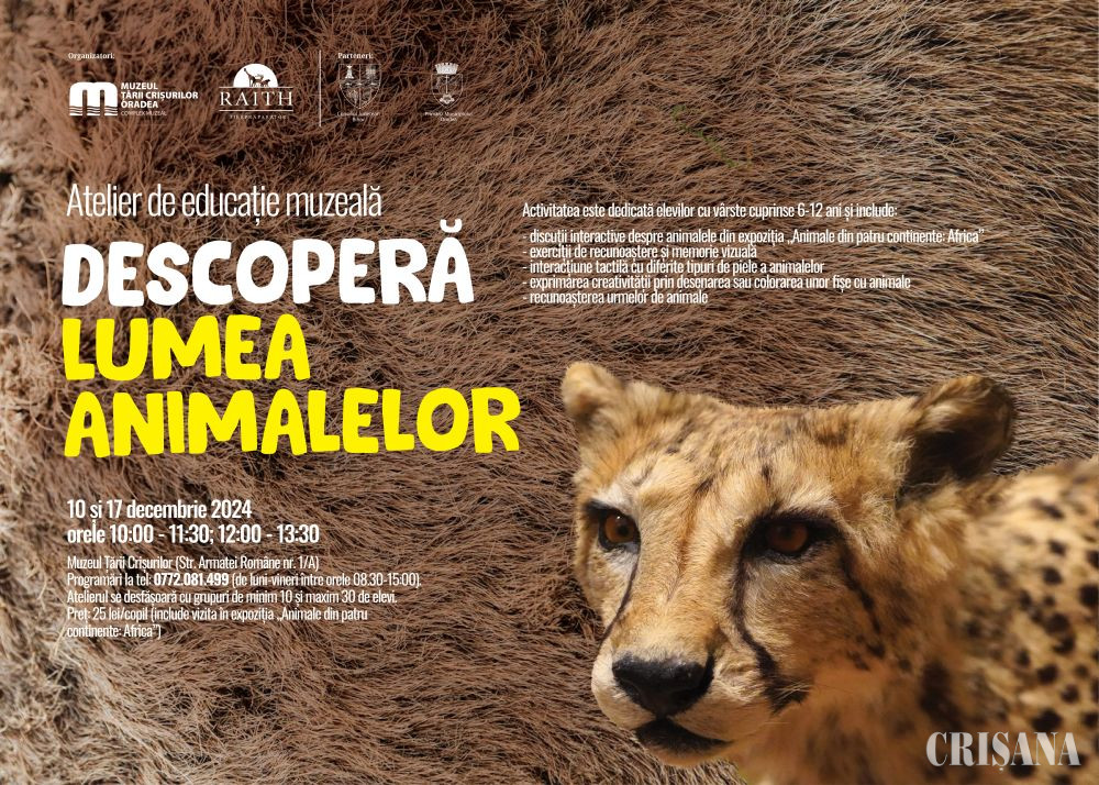 Muzeul Țării Crișurilor Oradea – Complex Muzeal împreună cu Präparator Raith GmbH organizează, cu sprijinul Consiliului Județean Bihor și al Primăriei Municipiului Oradea, atelierul de educație muzeală „Descoperă lumea animalelor”.