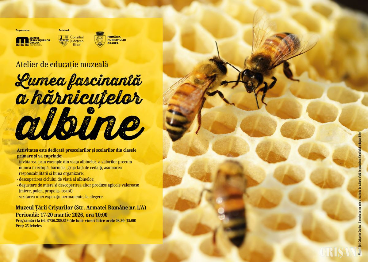 Muzeul Țării Crișurilor Oradea – Complex Muzeal organizează, împreună cu Consiliul Județean Bihor și Primăria municipiului Oradea, atelierul de educație muzeală „Lumea fascinantă a hărnicuțelor albine”. Acesta se va desfășura în perioada 17-20 martie, de la ora 10.00, la sediul instituției (str. Armatei Române nr. 1/A).