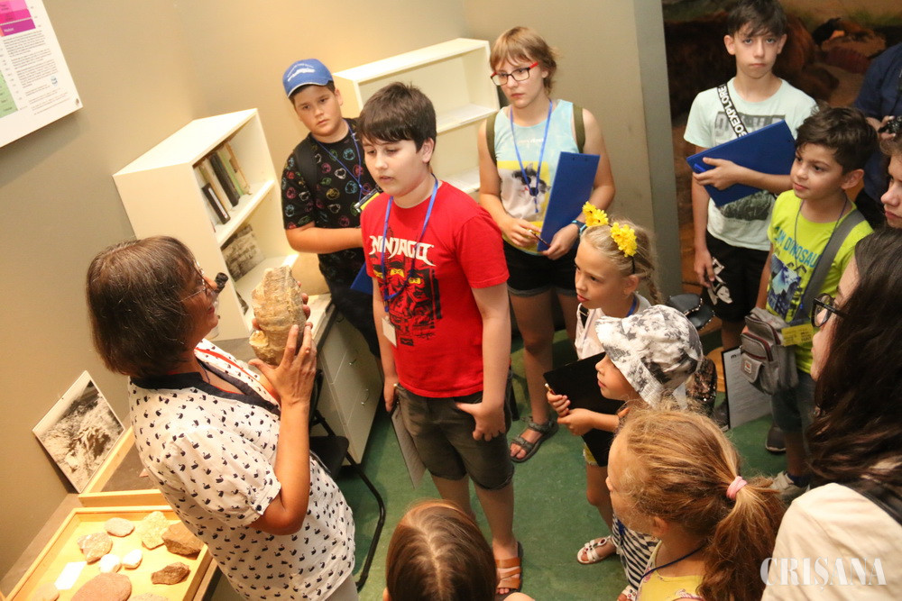 „Mergem sus, în expoziție, traversăm Tunelul Timpului, și ne vom opri în prima sală, unde este și Camera Cercetătorului. Acolo, veți afla ce avem noi în colecție, de la fosile, mod de fosilizare, formarea rocilor, prepararea/conservarea colecțiilor de paleontologie, zoologie etc.”, i-a anunțat muzeograful Erika Posmoșanu pe copii.