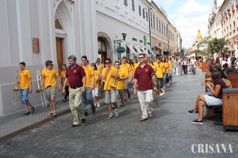 Fanfara din Csokmo a oferit un recital deosebit, ieri, orădenilor. Recitalul a luat startul pe platoul magazinului Crişul. Artiştii au recrutat participanţi pentru Ziua Sf. Ladislau în zona grupului statuar Holnaposok, iar apoi au urcat în Turnul Primăriei.