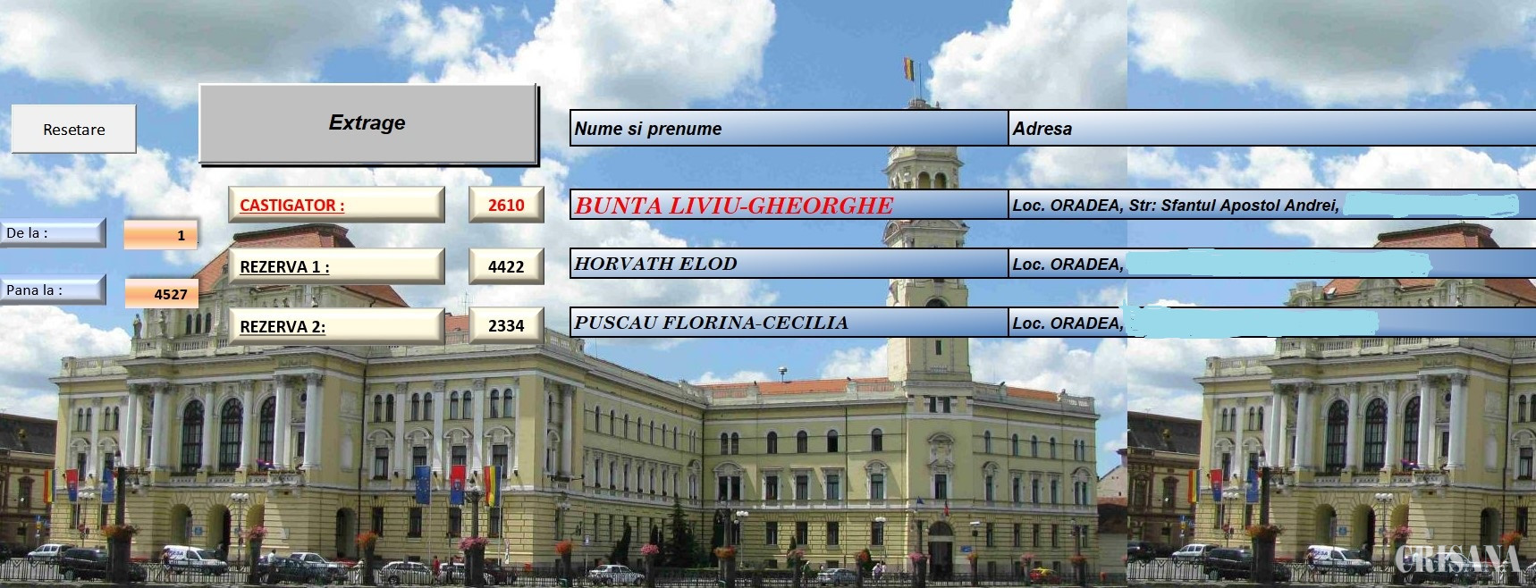 Potrivit Primăriei Oradea, la această extragere au fost înscriși 4.527 de contribuabili care și-au plătit online impozitele datorate pentru anul în curs în perioada 8-14 martie. Extragerea computerizată l-a desemnat câștigător pe Bunta Liviu Gheorghe, domiciliat pe str. Sfântul Apostol Andrei. Voucherul oferă o zi de acces la Aquaparkul Nymphaea pentru 2 adulți și 2 copii sub 18 ani şi este valabil până la sfârşitul anului.