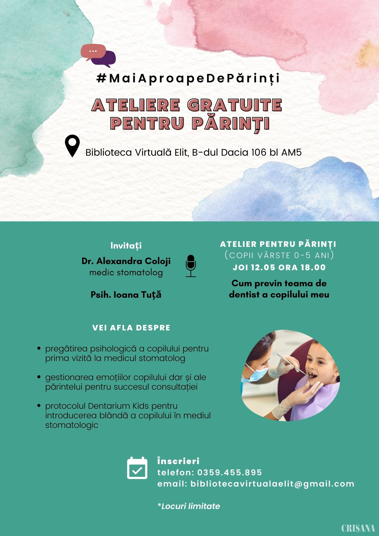 „A deveni părinte este una dintre cele mai frumoase, dar și dificile călătorii pe care le putem face, plină, deopotrivă, de bucurii și de provocări. Privind în urmă, cu toții ne-am fi dorit, înainte să devenim părinți, să avem acces la mai multă informație, sprijin și resurse privind impactul acestei experiențe asupra diferitelor domenii ale vieții noastre. În 12 mai, împreună cu dr. Alexandra Coloji, medic stomatolog, vorbim despre Cum previn teama de dentist a copilului meu. În plus, prin parteneriatul pe care l-am realizat cu doamna director Sanda Caba, de la Grădinița nr. 45, căreia îi mulțumim pe această cale pentru deschidere, avem planificate, de-a lungul întregii luni, activități educative pentru copiii din grupele mici și mijlocii din grădiniță, pe tema susținerii sănătății orale, urmând ca părinții acestora să obțină suport informațional și strategii pentru imersarea blândă în mediul stomatologic și pregătirea psihologică pentru prima vizită la dentist, la primul atelier din campanie”, a menționat Ioana Tuță, psiholog clinician și psihoterapeut.