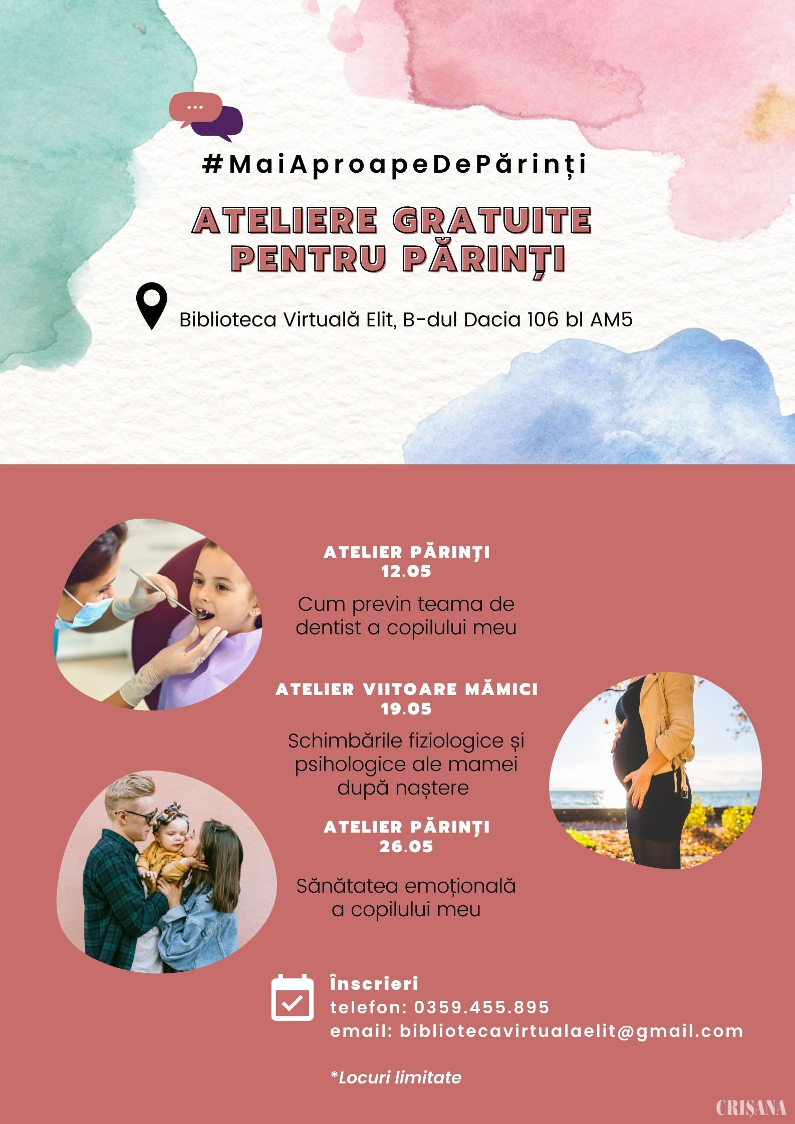 În 19 mai, va avea loc un atelier pentru viitoarele mămici, unde dr. Ioana Zaha, medic specialist obstetrică-ginecologie, va oferi suport și informații despre schimbările fiziologice și psihologice ale mamei după naștere.