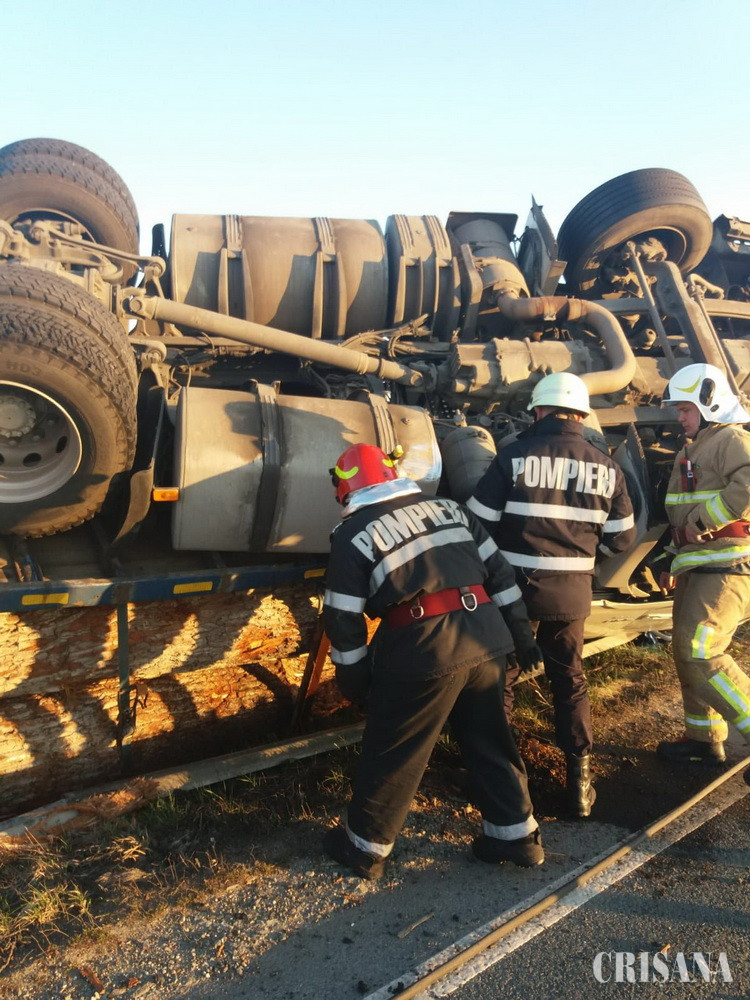 Un camion încărcat cu buşteni s-a răsturnat, ieri dimineaţă, Inspectoratul pentru Situaţii de Urgenţă „Crişana” mobilizând două echipaje la faţa locului. Şoferul a suferit leziuni uşoare şi a refuzat să fie transportat la spital.
