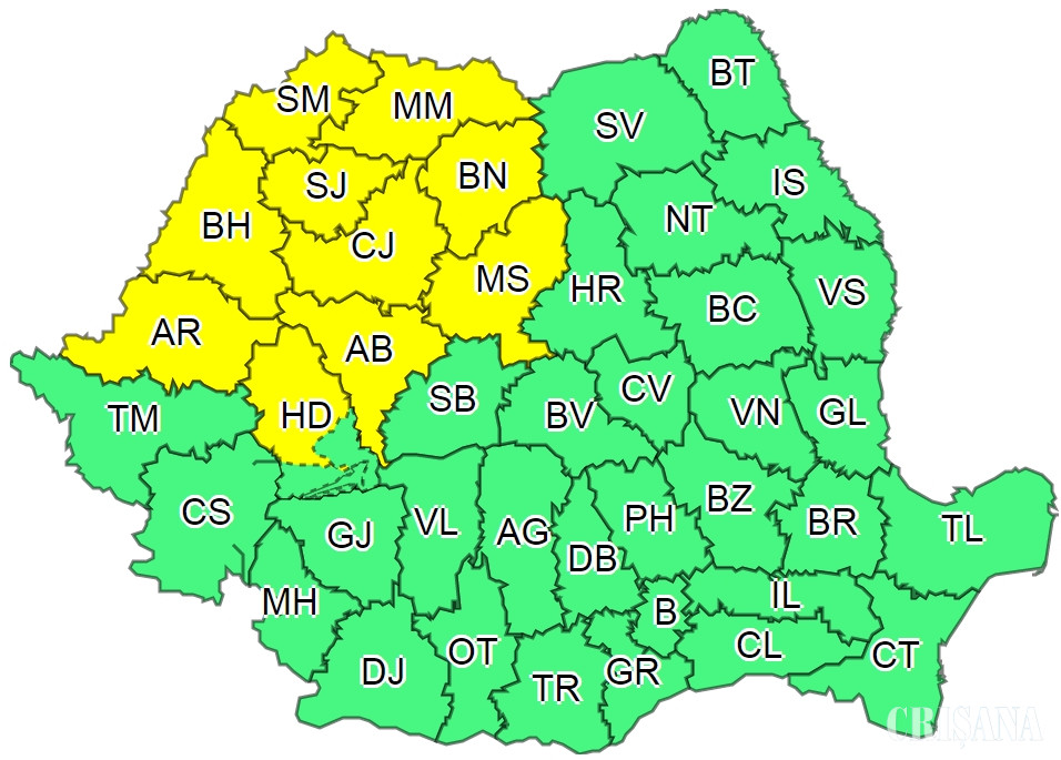 De luni de la ora 22.00 până marți la ora 10.00 va fi Cod galben de instabilitate atmosferică în vestul, nord-vestul și centrul țării. Aceasta se va manifesta prin frecvente descărcări electrice, intensificări ale vântului (rafale în general de 55-70 km/h și izolat peste 80 km/h), vijelii, averse ce vor avea și caracter torențial (în intervale foarte scurte de timp cantitățile de apă vor fi de 20-25 l/mp și izolat peste 30-40 l/mp) și grindină.