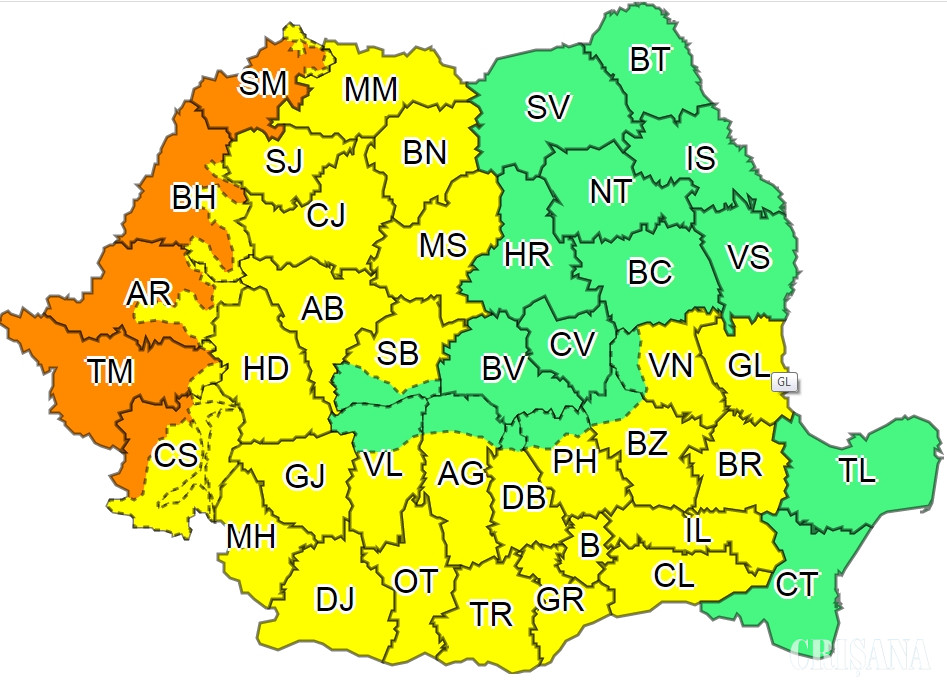 Este cod portocaliu de caniculă în cinci județe din zona de Vest a țării, unde temperaturile vor fi de 37 - 39 de grade în stația de măsurare. Disconfortul termic va fi accentuat. În Nord-Vest, Centru, Sud și Sud - Este este cod galben de caniculă.