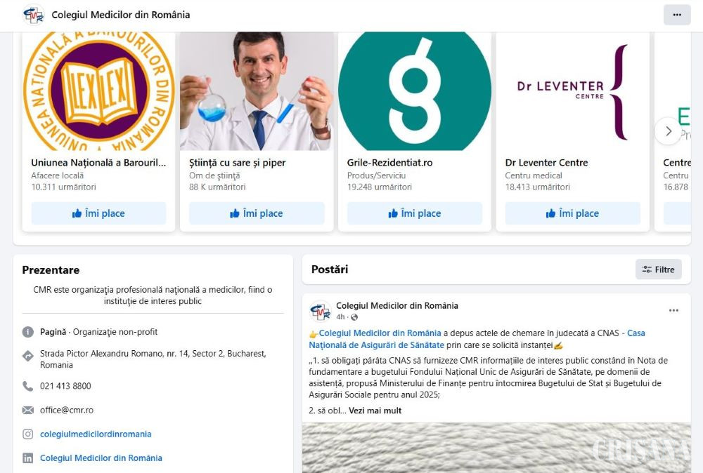 Colegiul Medicilor din România a anunțat duminică că a depus actele de chemare în judecată a CNAS. Potrivit unei postări pe pagina de Facebook a Colegiului Medicilor, organizația cere instanței să oblige CNAS să furnizeze informațiile de interes public constând în Nota de fundamentare a bugetului Fondului Național Unic de Asigurări de Sănătate, pe domenii de asistență, propusă Ministerului de Finanțe pentru întocmirea Bugetului de Stat și Bugetului de Asigurări Sociale pentru anul 2025.