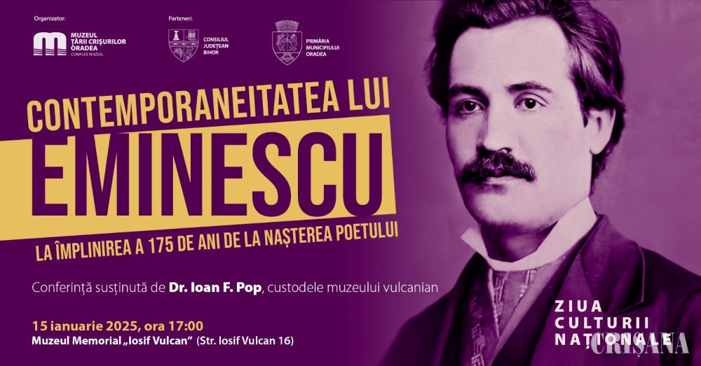 Evenimentul va avea loc miercuri, 15 ianuarie, de la ora 17.00, la Muzeul Memorial „Iosif Vulcan” (str. Iosif Vulcan nr. 16). Conferința readuce în discuție corespondența scrisului lui Eminescu, „omul deplin al culturii românești”, cu lumea contemporană, dar și influența destinală a lui Iosif Vulcan. Conferința va fi susținută de muzeograful dr. Ioan F. Pop.