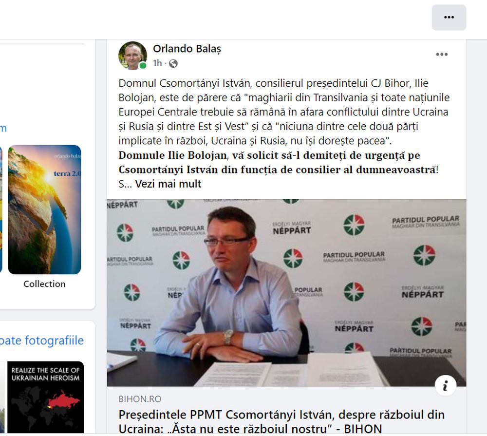 ”Domnule Ilie Bolojan vă solicit să-l demiteți de urgență pe Csomortányi István din funcția de consilier al dumneavoastră! Sîntem țară membră NATO și UE, iar declarațiile domnului consilier sînt un act de trădare față de alianțele din care facem parte.