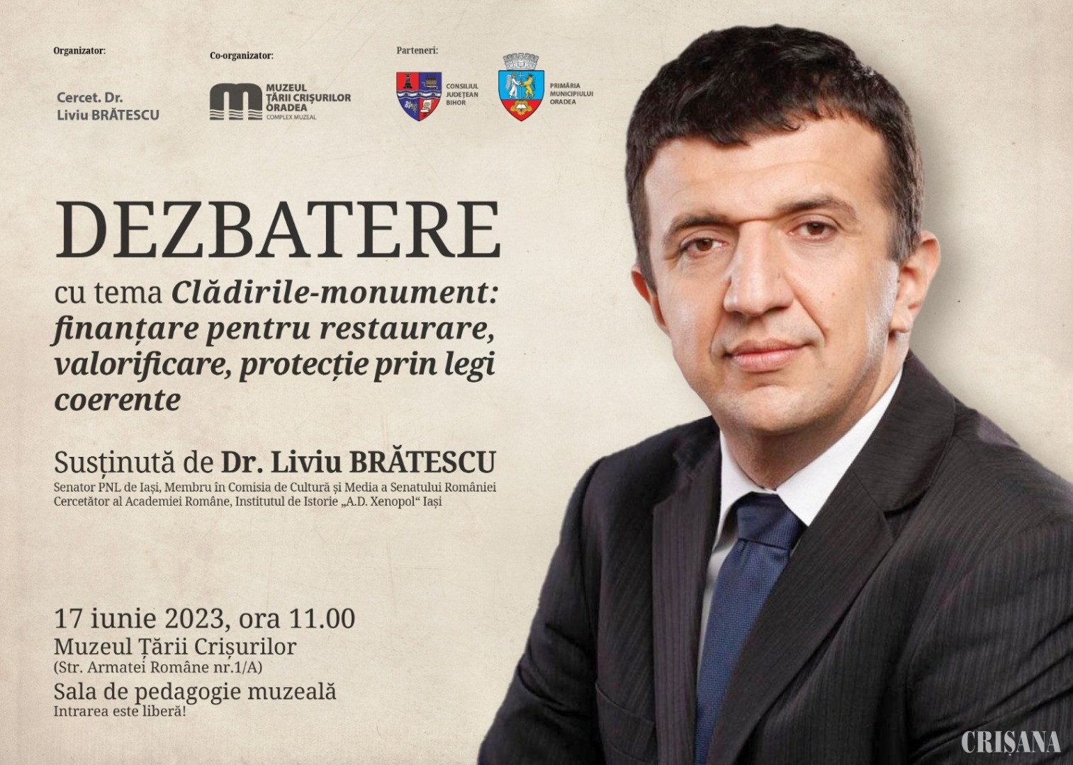 Muzeul Țării Crișurilor Oradea invită publicul interesat la o dezbatere cu tema „Clădirile-monument: finanțare pentru restaurare, valorificare, protecție prin legi coerente”, inițiată și susținută de către dr. Liviu Brătescu, membru în Comisia de Cultură și Media a Senatului României și Cercetător al Academiei Române, Institutul de Istorie „A.D. Xenopol“ Iași.