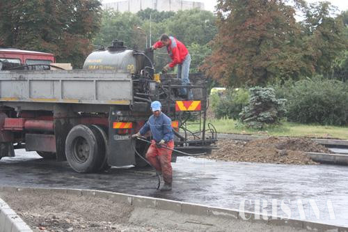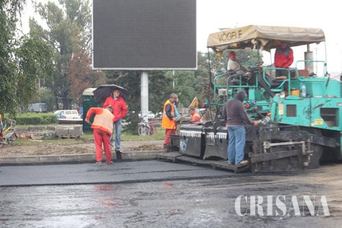 Ploaia de ieri nu i-a speriat pe drumarii care asfaltau de zor în Centrul Civic. Cele 12 zile până la începerea noului an şcolar sunt decisive pentru finalizarea lucrărilor de înlocuire a liniilor de tramvai, aşa că, atât angajaţii firmei Selina, care au contractul pentru calea de rulare, cât şi ai Drumurilor Orăşeneşti care trebuie să realizeze noua giraţie, au decis să ignore stropii de ploaie şi să-şi vadă de lucru.