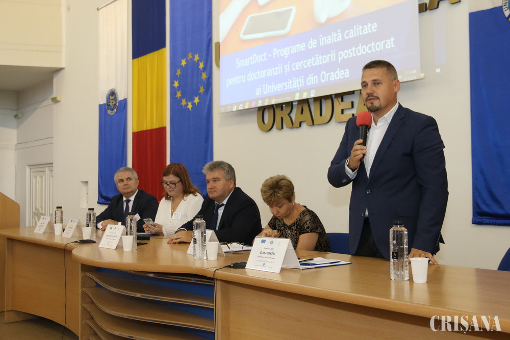 80 de doctoranzi şi 35 de cercetători de la programe postdoctorale vor fi selectaţi pentru a face parte din programul SmartDoc, un program care își propune creşterea numărului absolvenţilor de doctorat şi postdoctorat ai Universităţii din Oradea care îşi găsesc un loc de muncă sau iniţiază propria afacere, cu prioritate în sectoarele economice cu potenţial competitiv identificate conform Strategiei Naționale de Competitivitate (SNC) şi domeniile de specializare inteligentă conform Strategiei Naționale de Cercetare-Dezvoltare-Inovare (SNCDI), urmare a accesului la programe de înaltă calitate, cu aplicaţii directe în economie, dezvoltate în parteneriat cu mediul de afaceri. Conferința de prezentare a proiectului a avut loc ieri, în Aula Magna a Universității din Oradea, în prezența rectorului Constantin Bungău, a șefului AJOFM, Bekesi Csaba, a directorului Consiliului pentru Studiile Universitare de Doctorat al Universității – Radu Țarcă, a decanului Facultății de Științe Economice - Alina Bădulescu și a asistentului manager proiect – Anca Dodescu.