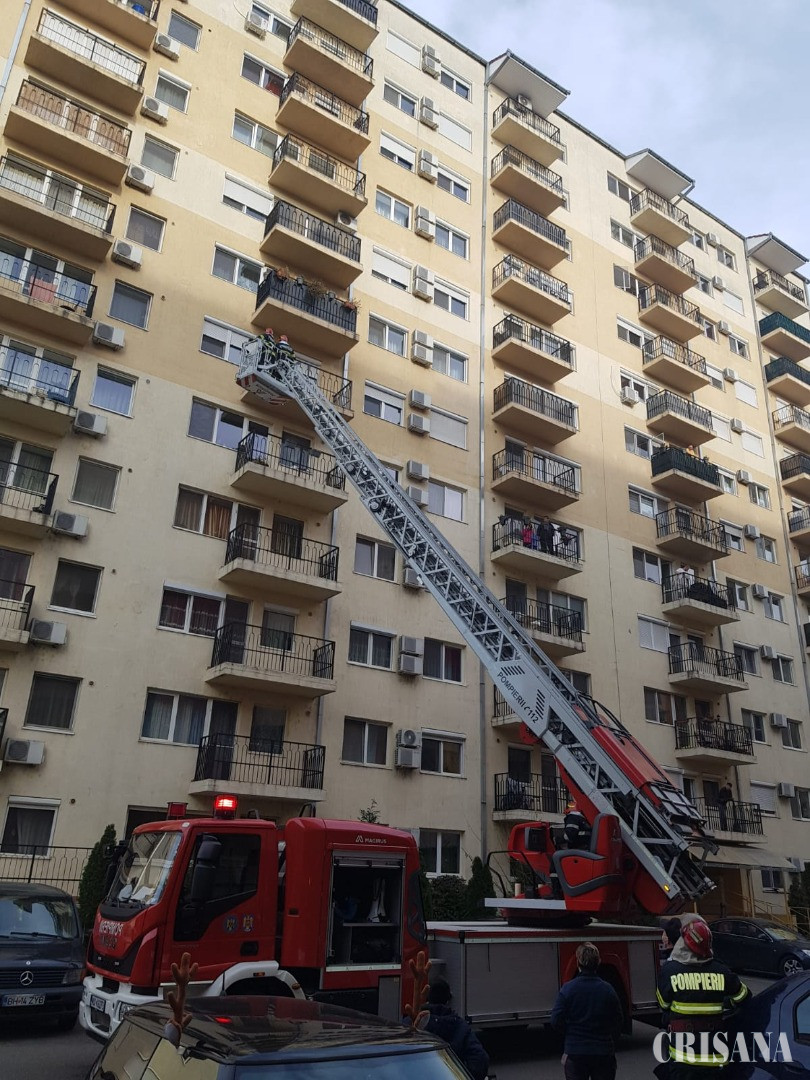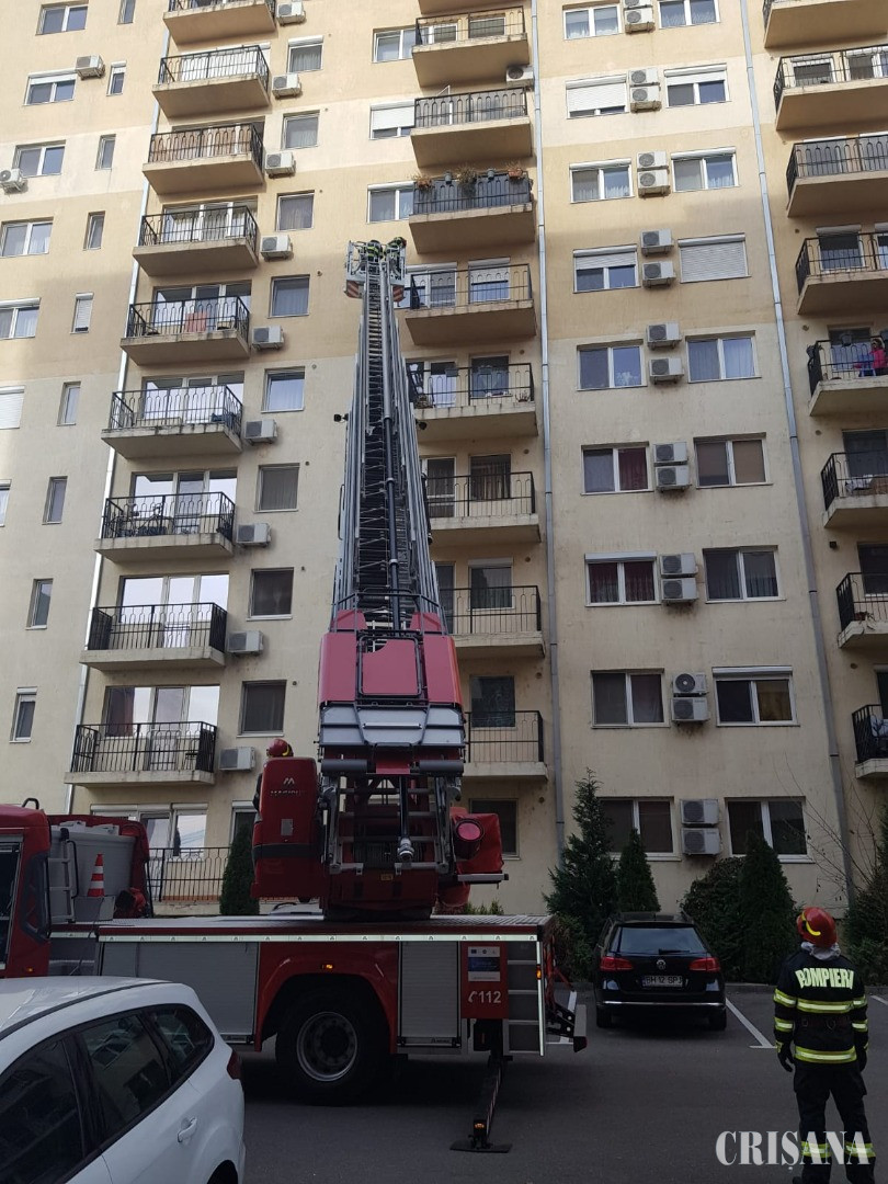 O fetiţă în vârstă de trei ani a rămas blocată în apartamentul de la etajul cinci, mama ei sunând la 112 pentru a fi ajutată. Micuţa a închis uşa din joacă, în timp ce mama ieşise în casa scării.