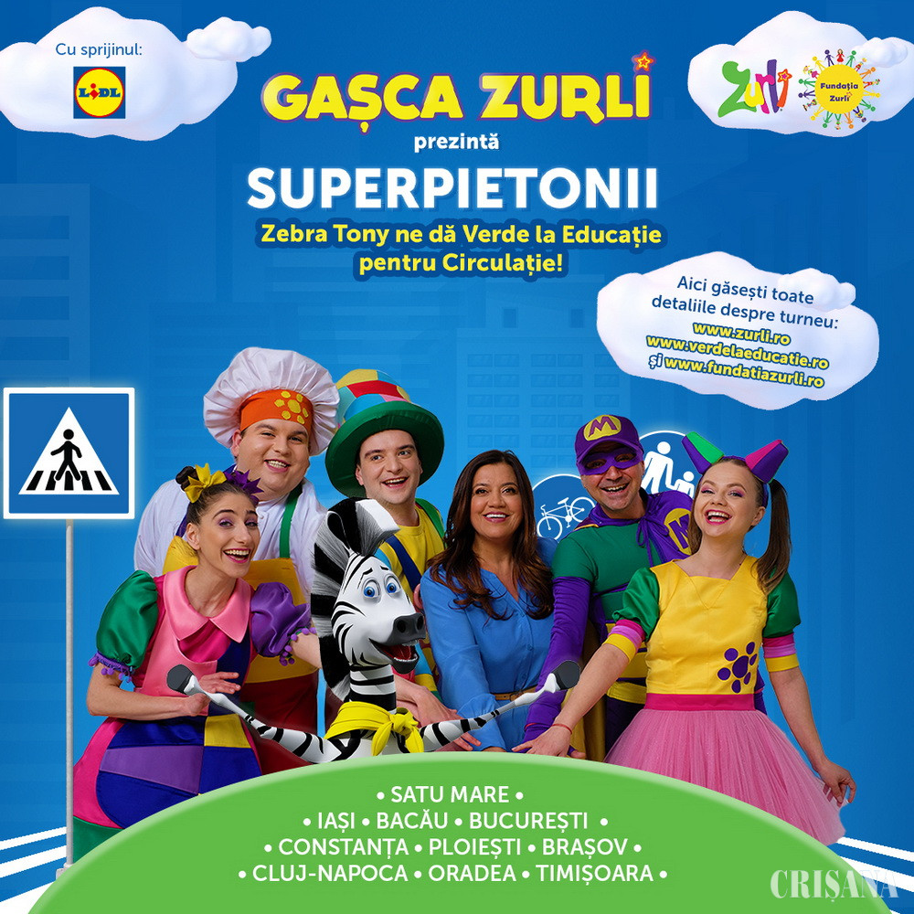 Gașca Zurli continuă programul „Verde la educație pentru circulație”, prin turneul național „Superpietonii”. Începând cu 25 septembrie, Gașca Zurli și Zebra Tony se vor opri, pe rând, în: Satu Mare, Iași, Bacău, București, Constanța, Ploiești, Brașov, Cluj-Napoca, Oradea și Timișoara. Biletele pentru spectacolele „Superpietonii” pot fi cumpărate online pe Entertix.ro și MyTicket.ro.