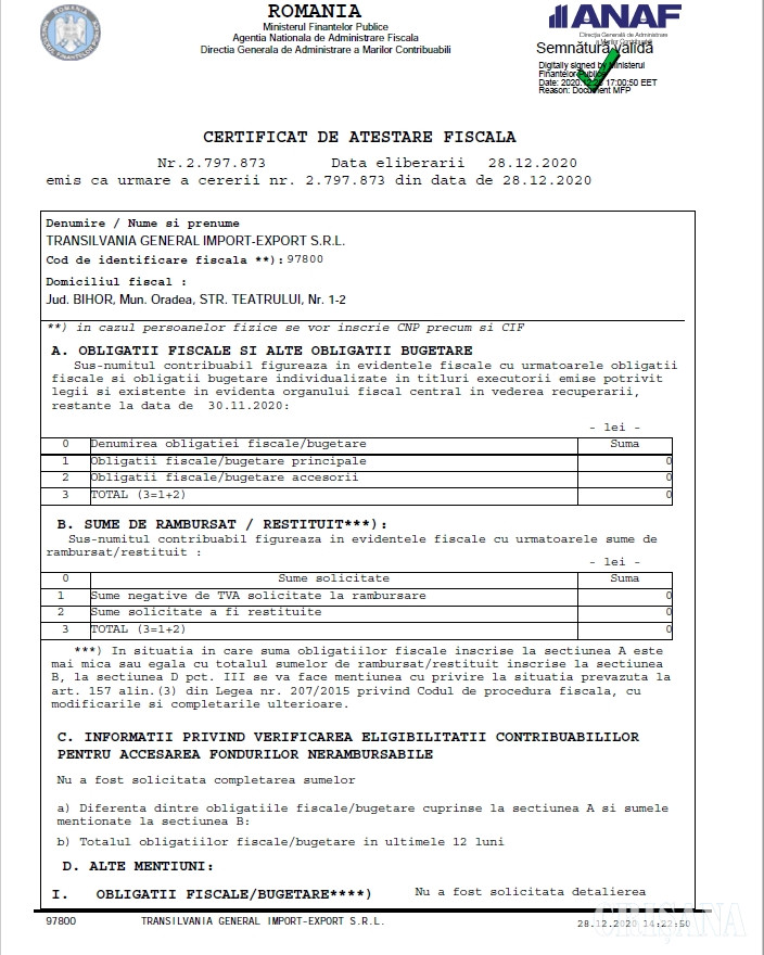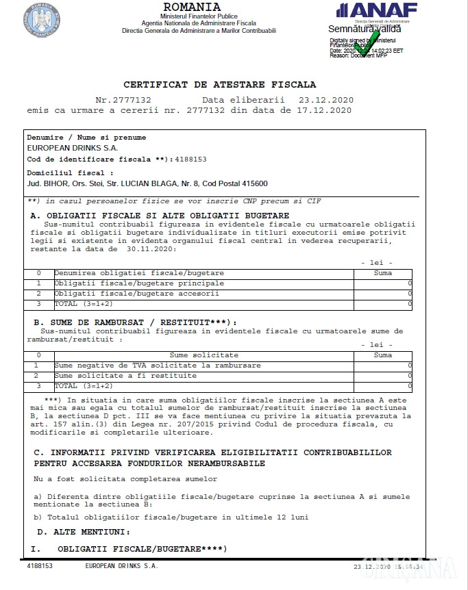 Iată însă că în această perioadă dificilă, care a pus la grea încercare întreaga economie, companiile cunoscute de opinia publică sub numele de Grupul Transilvania General Import-Export sau European Food&Drinks, avându-i ca acționari pe domnii Ioan Micula și Viorel Micula, au plătit, în perioada decembrie 2019-decembrie 2020, către bugetele de stat centrale şi locale, impozite şi taxe în valoare de 531.718.212 lei, reprezentând echivalentul a 110.774.627 euro! Astfel, la finalul anului 2020, companiile nu înregistrau datorii la bugetele de stat, asa cum rezulta și din certificatele fiscale emise de Ministerul Finanțelor.