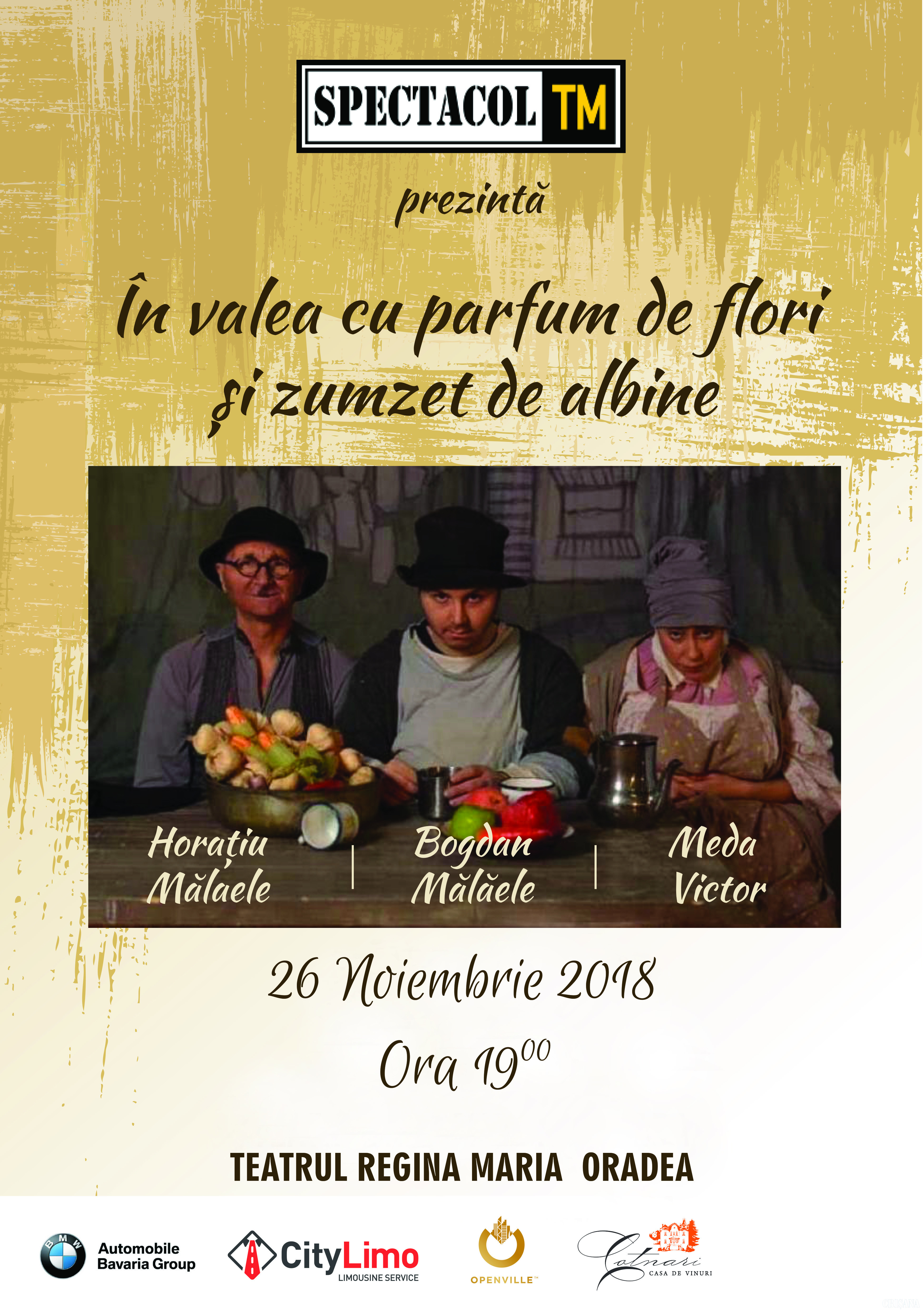 Oradea se transformă în „Valea cu parfum de flori și zumzet de albine” luni, 26 noiembrie. Horațiu Mălăele va urca pe scena Teatrului Regina Maria, începând cu ora 19.00, alături de fiul său, Bogdan Mălăele, și actrița Meda Victor.